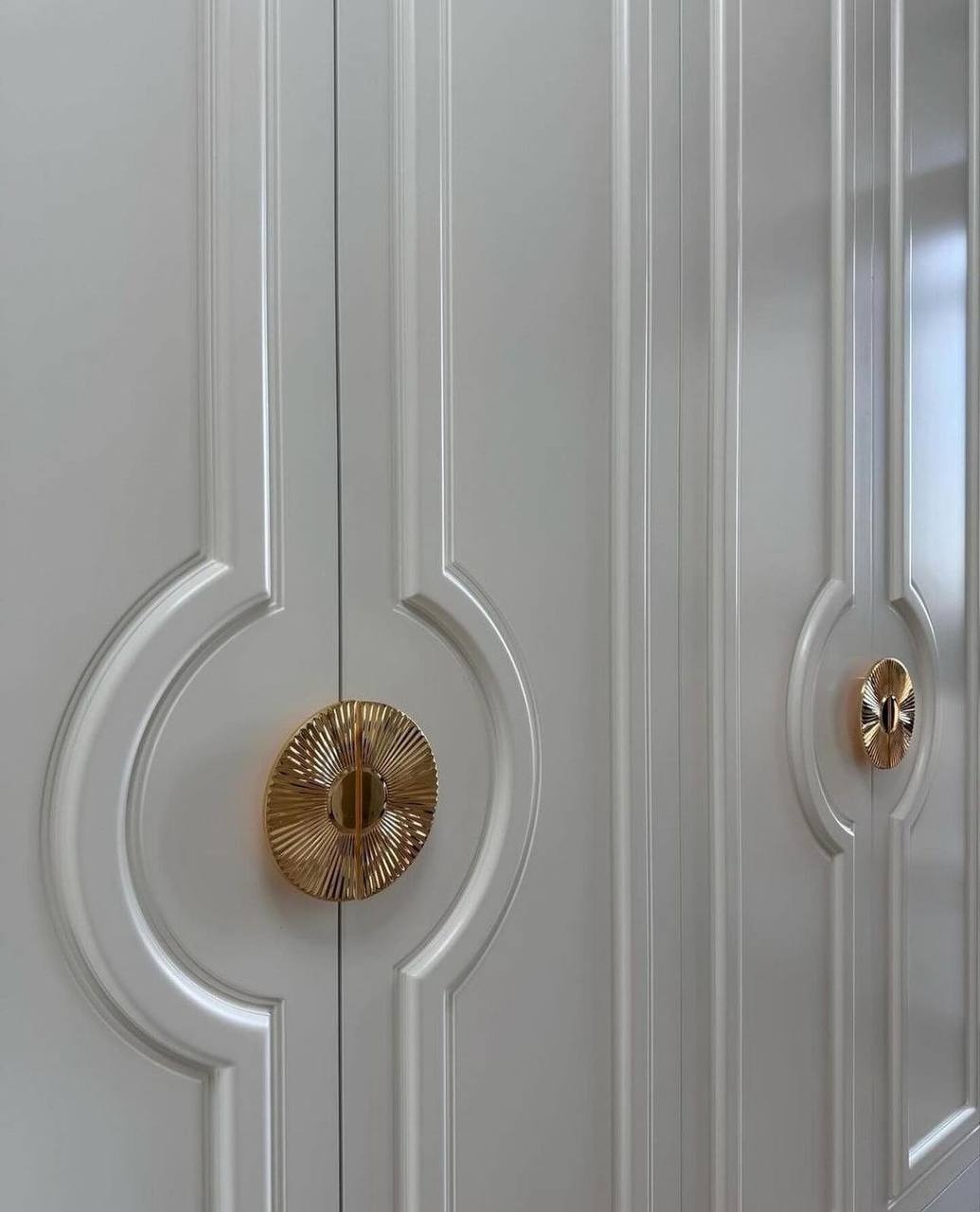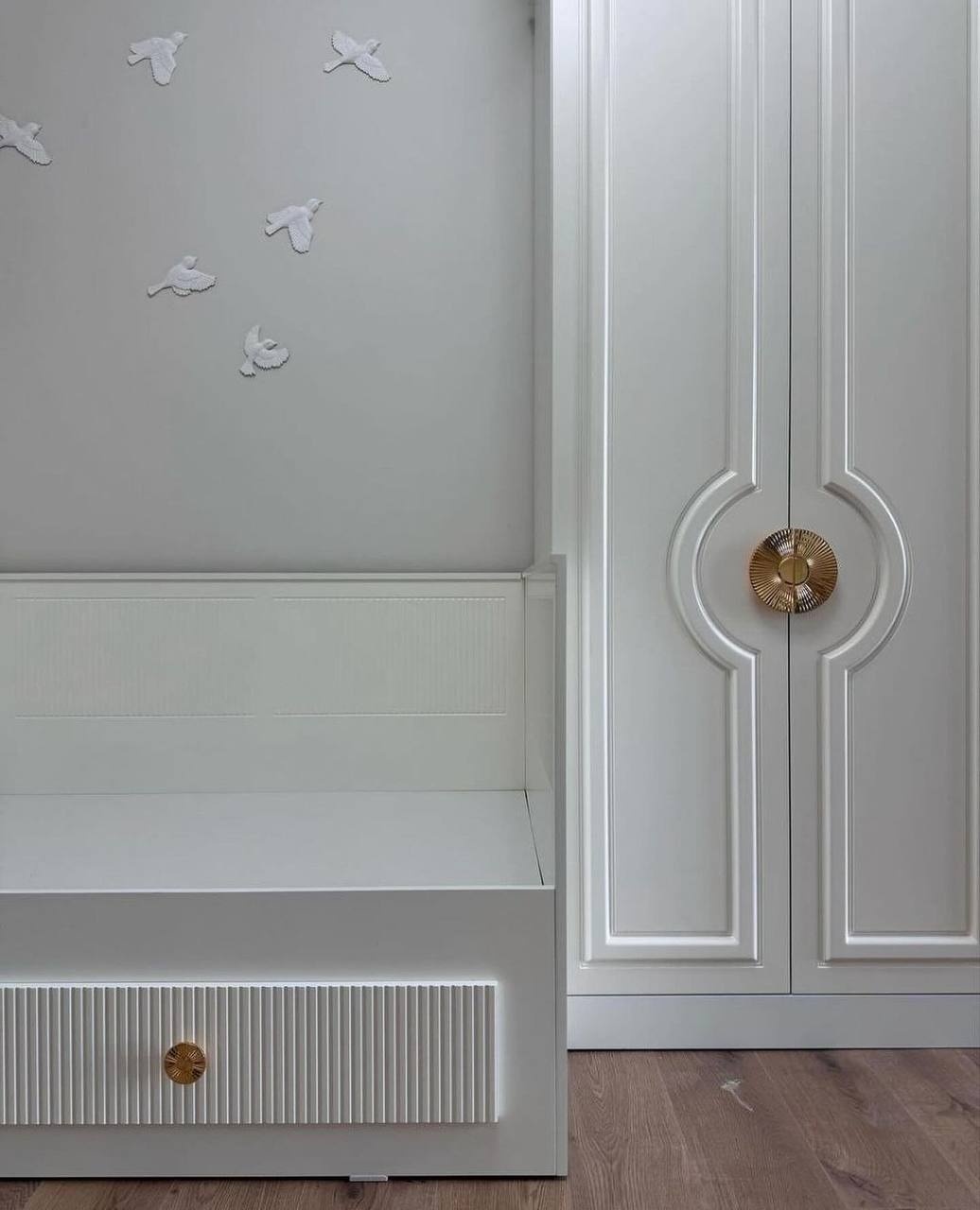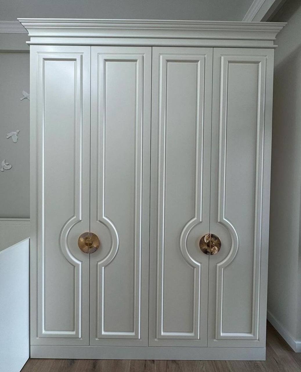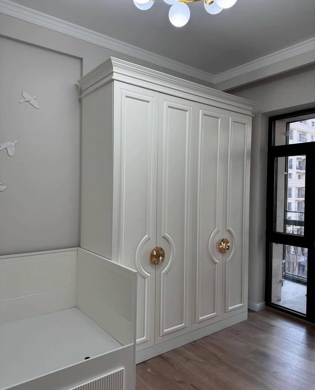 Элегантный распашной шкаф в благородном белом цвете с высокими филенчатыми фасадами и крупными золотыми ручками станет выразительным акцентом в интерьере. Продуманное внутреннее наполнение обеспечивает удобное хранение одежды и аксессуаров, а классический дизайн гармонично сочетается с рабочей зоной и детской мебелью.