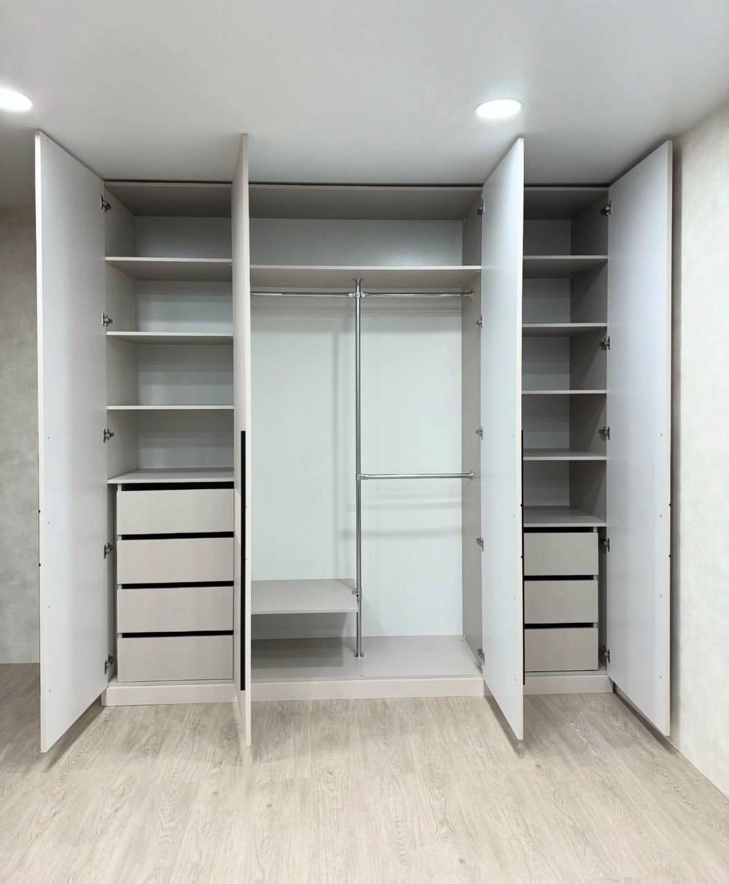 Современный распашной шкаф во всю стену с лаконичным белым фасадом и горизонтальной рифлёной вставкой. Внутри предусмотрены штанги для одежды, открытые полки и выдвижные ящики, что обеспечивает удобную организацию гардероба. Высокие чёрные ручки подчеркивают минималистичный дизайн и делают шкаф выразительным акцентом интерьера.
