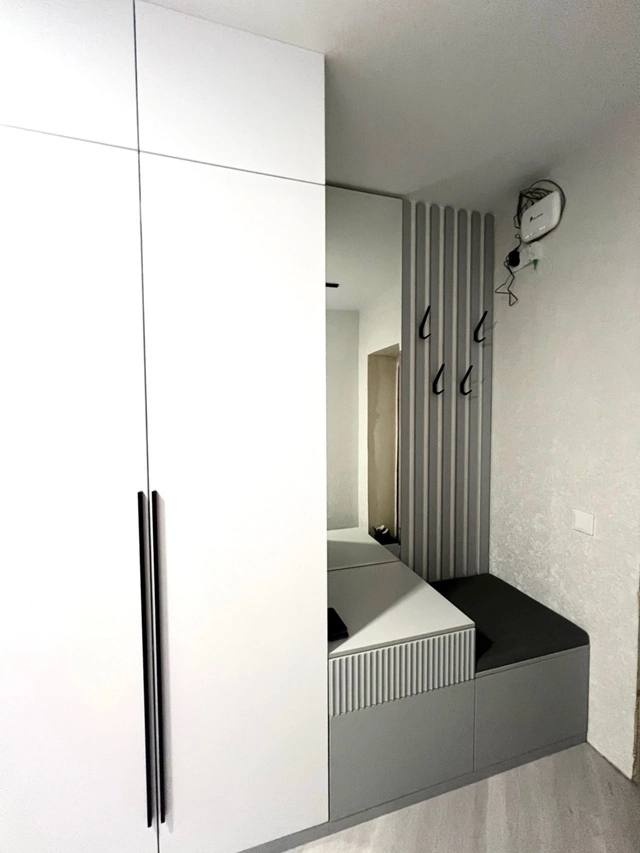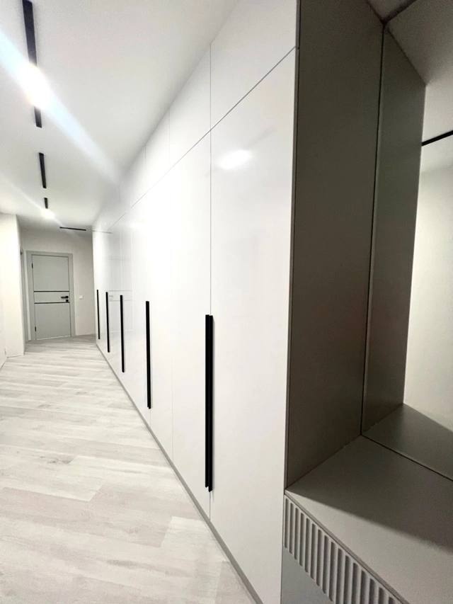 Лаконичный распашной шкаф во всю длину коридора создан для максимального использования пространства. Гладкие белые фасады с контрастными черными ручками подчеркивают современный стиль интерьера. Встроенный модуль-прихожая с мягким сиденьем, крючками и зеркалом обеспечивает удобство хранения верхней одежды и обуви.