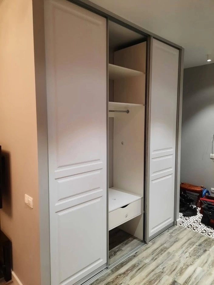 Вместительный белый шкаф-купе с тремя раздвижными дверями и аккуратными филёнчатыми фасадами органично впишется в современный интерьер. Внутреннее наполнение включает несколько полок, штангу для одежды и блок выдвижных ящиков, обеспечивающих удобное хранение вещей и аксессуаров даже в компактных помещениях.