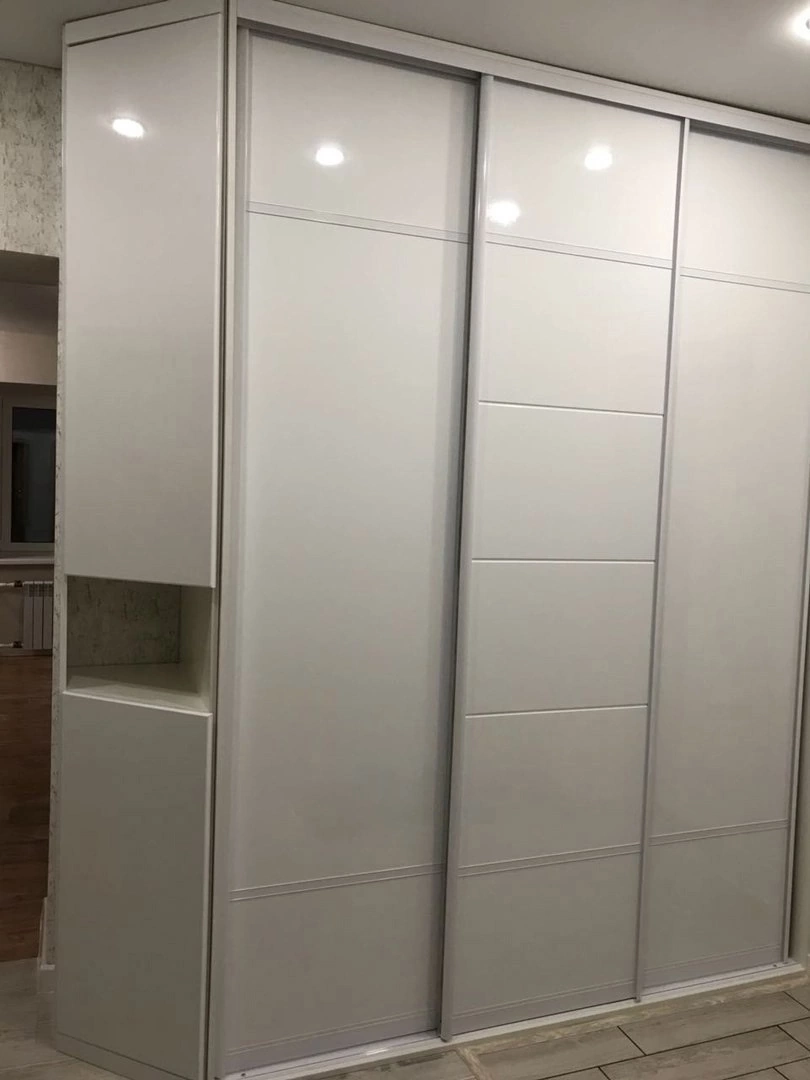 Современный шкаф-купе в белом цвете с тремя раздвижными глухими фасадами и боковым модулем с нишами. Лаконичный дизайн визуально расширяет пространство и идеально подходит для прихожей или коридора. Вместительные внутренние секции обеспечивают удобное хранение одежды, обуви и аксессуаров, поддерживая порядок в доме.