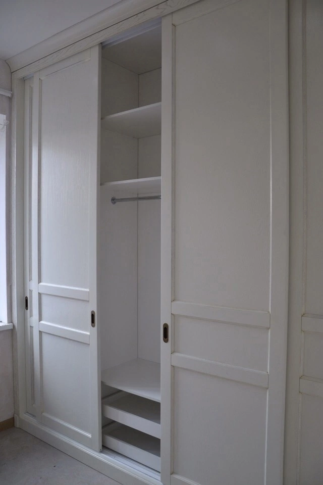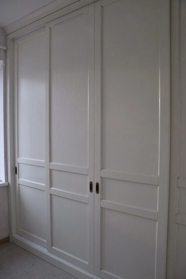 Вместительный белый шкаф-купе с тремя раздвижными фасадами в классическом оформлении. Внутри предусмотрены полки, штанга для одежды и удобные нижние секции для обуви или коробок. Встроенная конструкция экономит пространство, аккуратно заполняя нишу и создавая единую поверхность стены, идеально подходящую для спальни или прихожей.