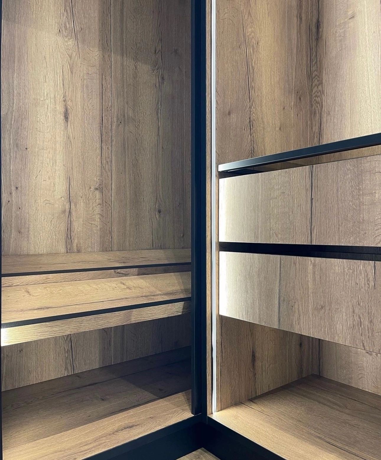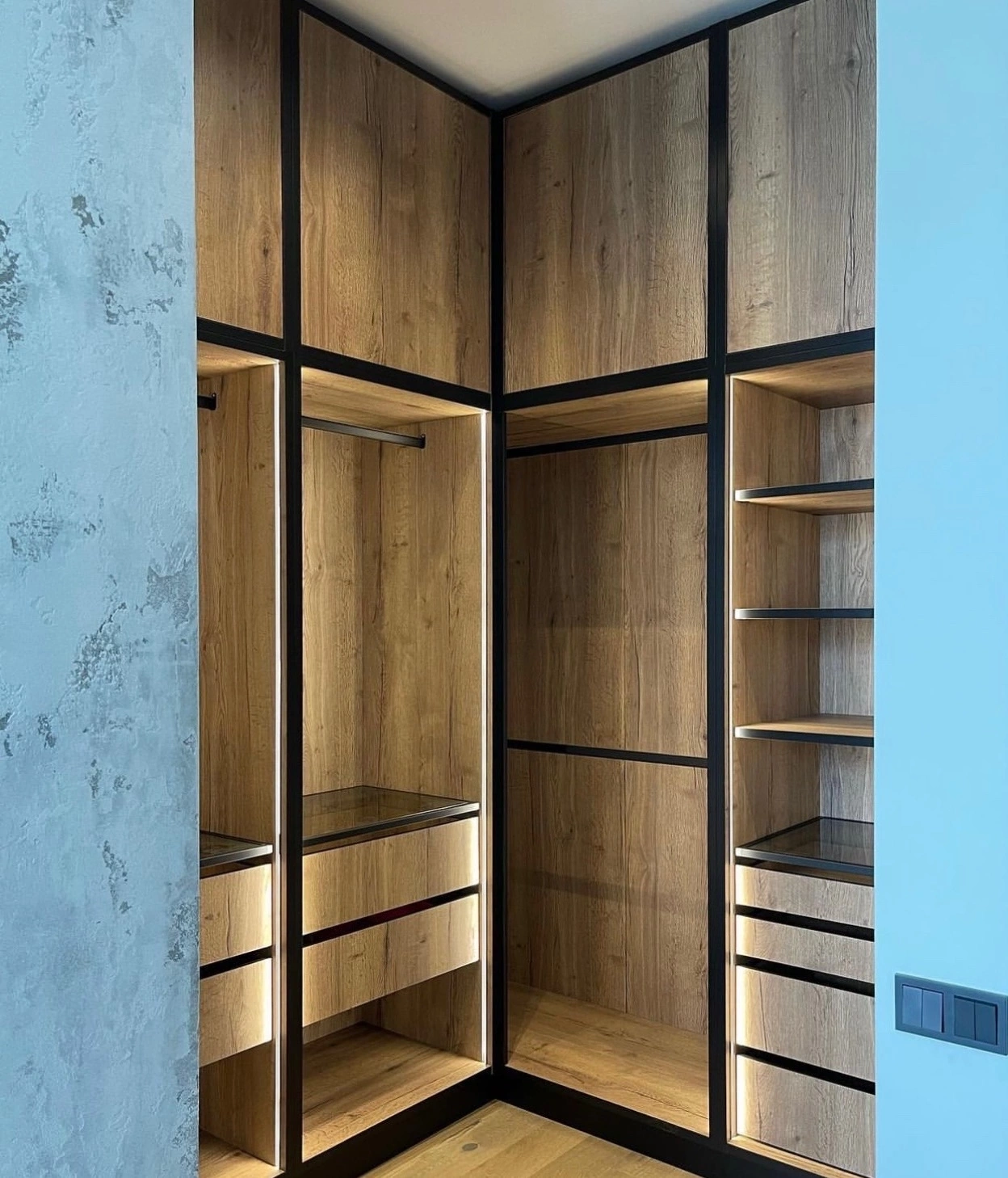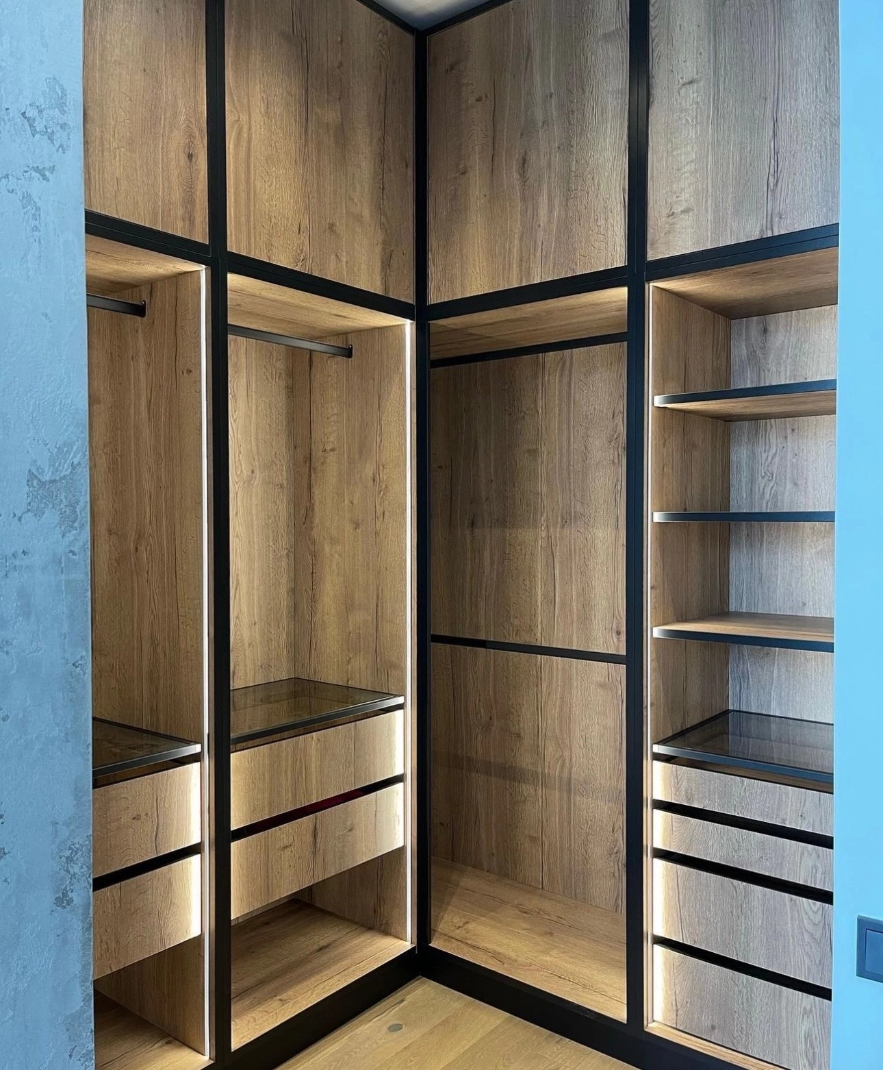 Угловая гардеробная в современном стиле с тёплой фактурой дерева и минималистичными чёрными рамками. Продуманная система штанг, выдвижных ящиков и стеклянных полок обеспечивает удобное хранение одежды и аксессуаров, подчёркнутое мягкой контурной подсветкой.