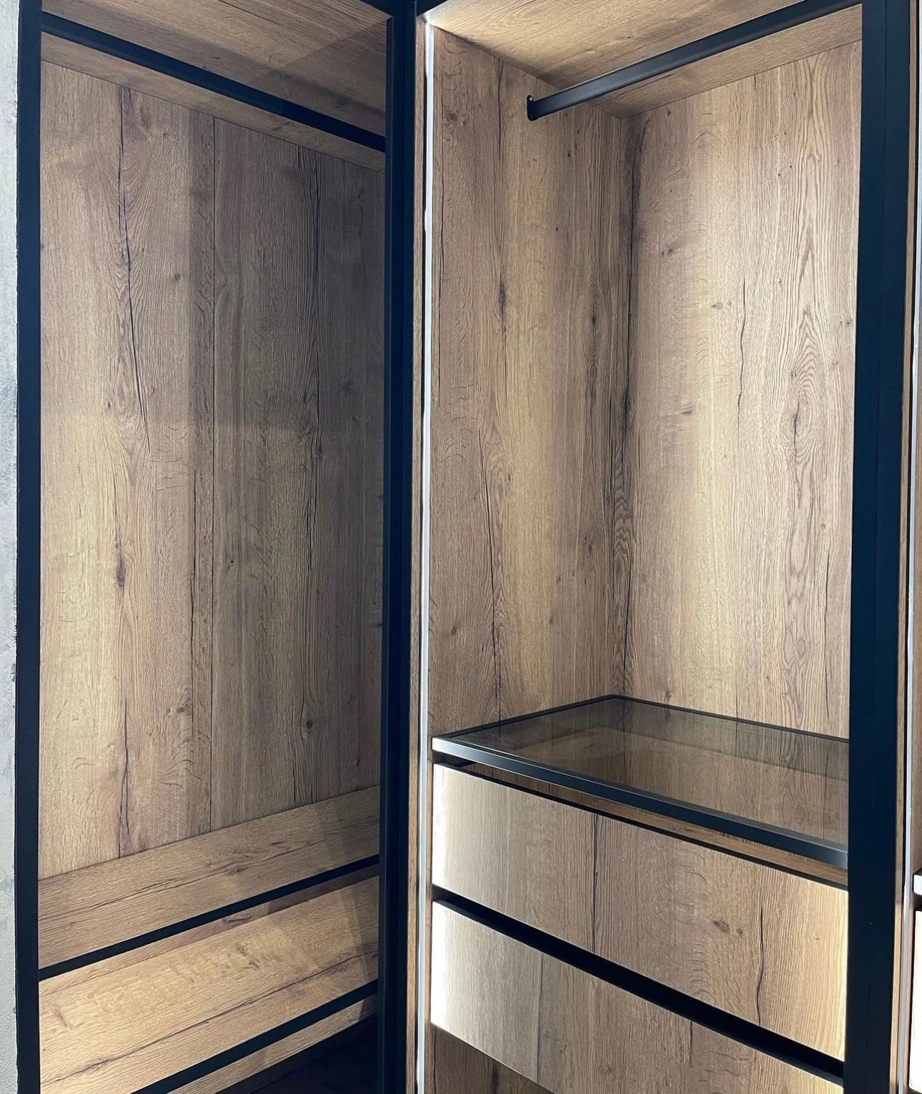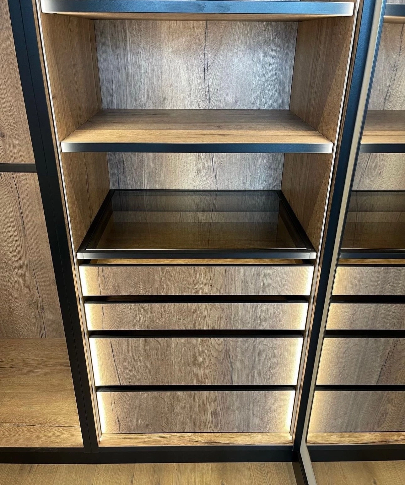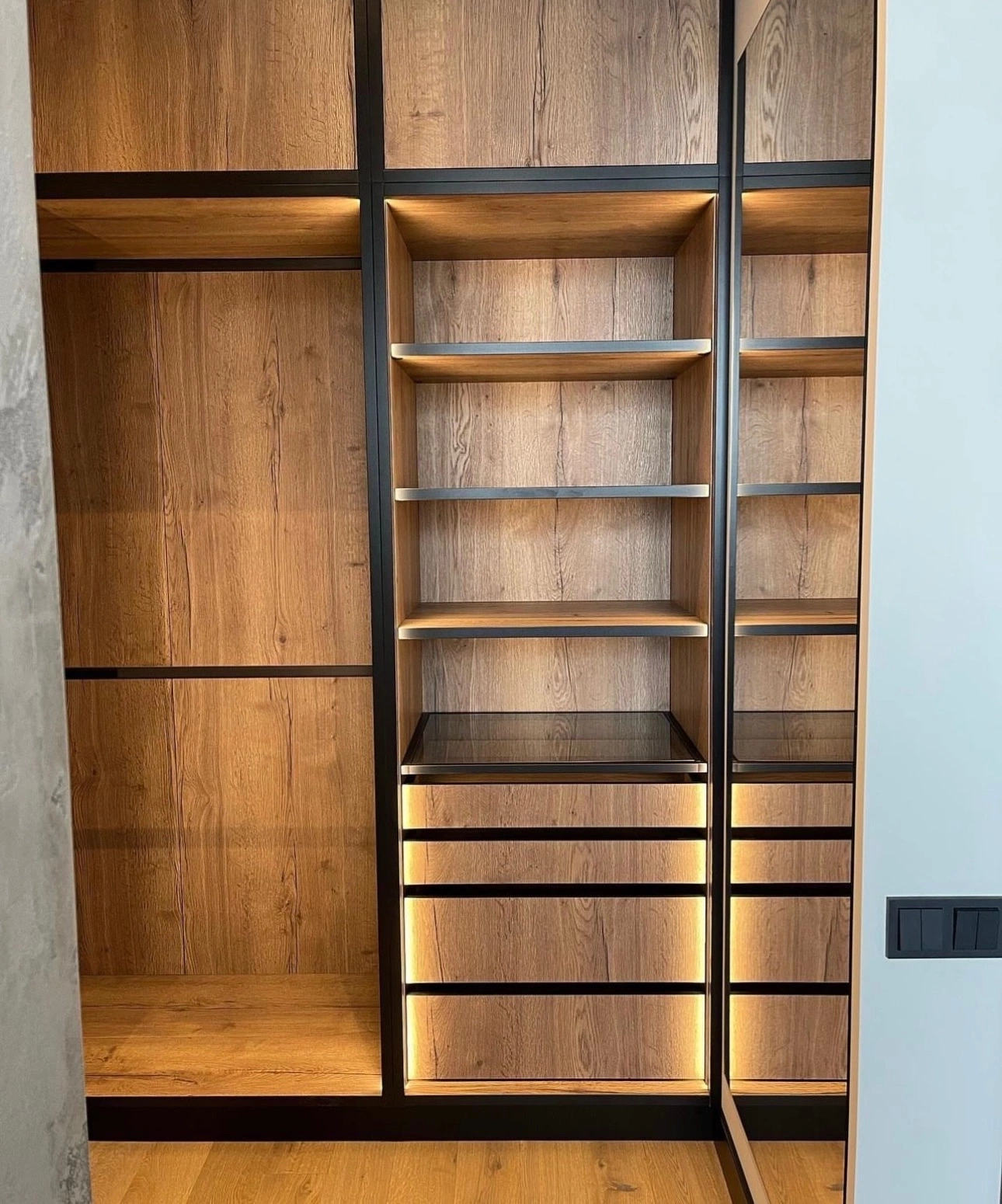 Угловая гардеробная в современном стиле с тёплой фактурой дерева и минималистичными чёрными рамками. Продуманная система штанг, выдвижных ящиков и стеклянных полок обеспечивает удобное хранение одежды и аксессуаров, подчёркнутое мягкой контурной подсветкой.