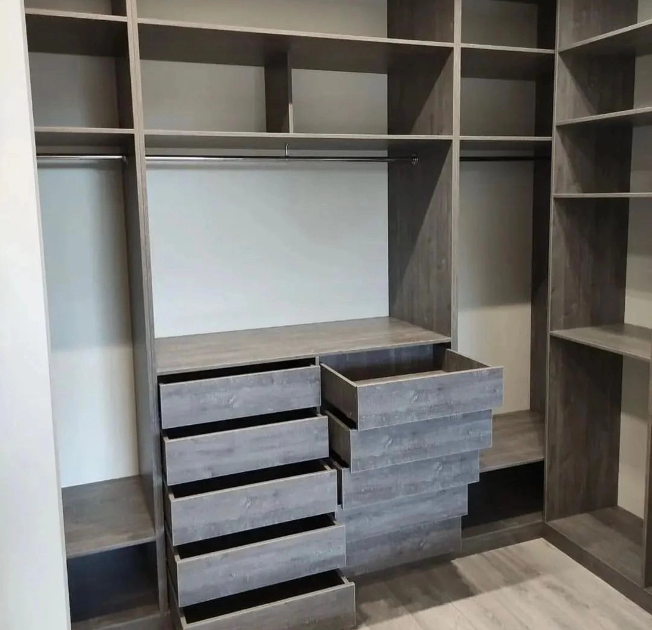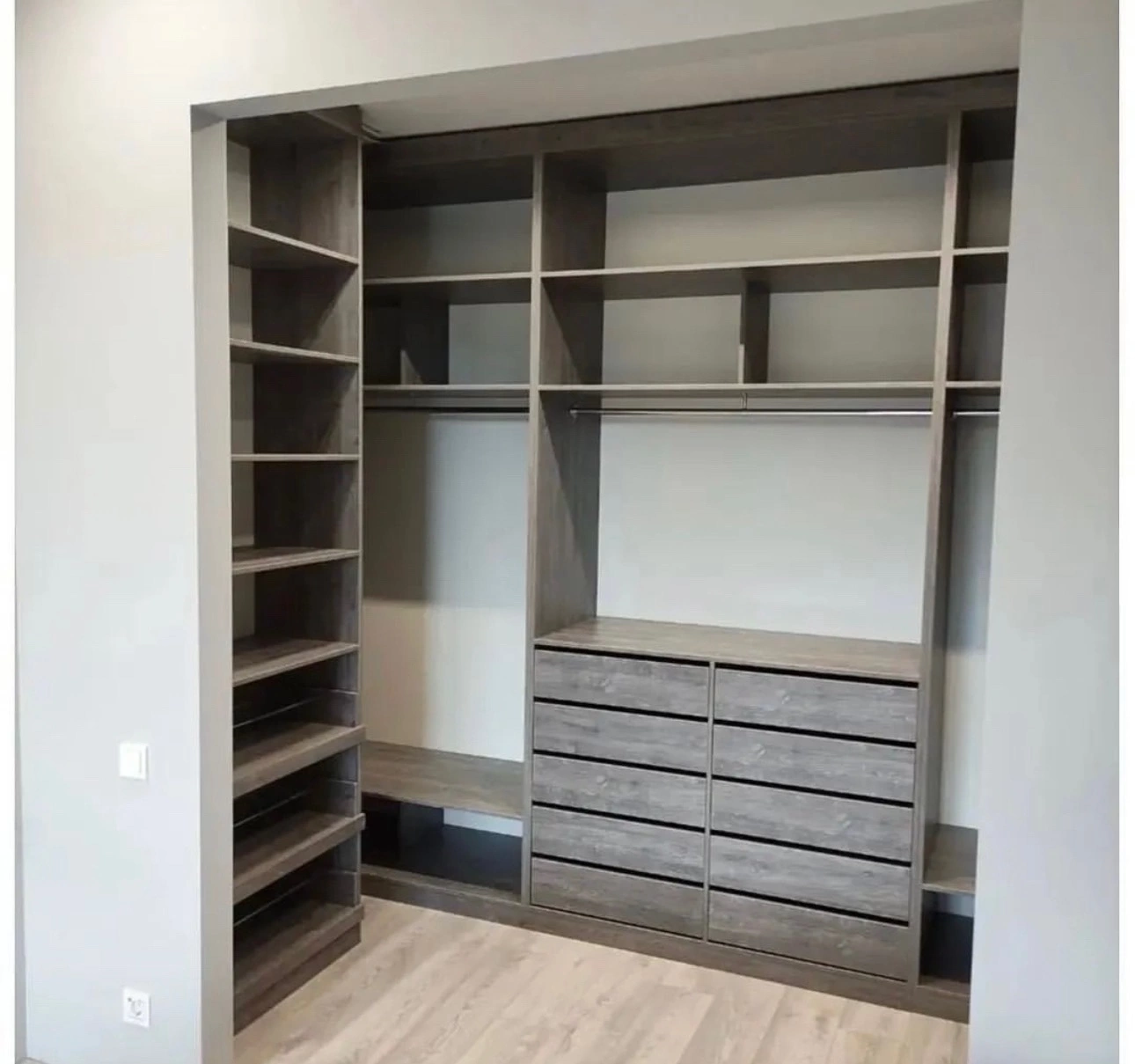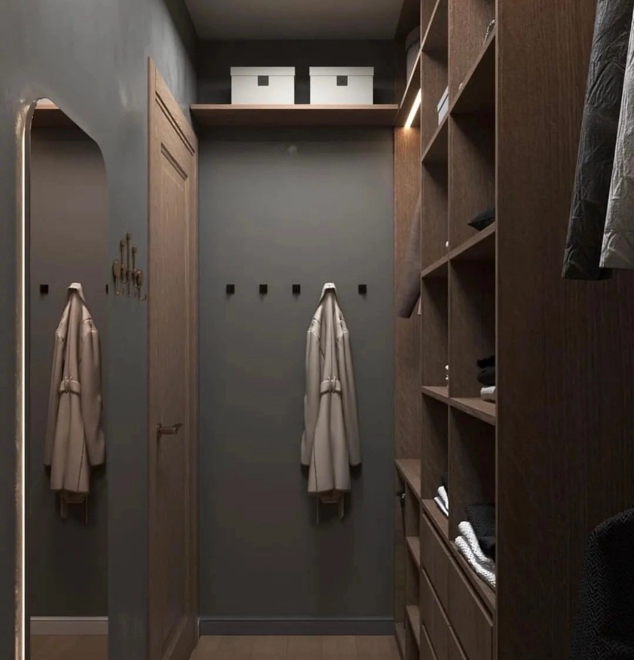 Функциональная гардеробная с открытыми секциями, выдвижными ящиками и штангами для одежды. Продуманное расположение полок, ниш и мест под обувь обеспечивает удобную организацию вещей и поддержание идеального порядка в пространстве.