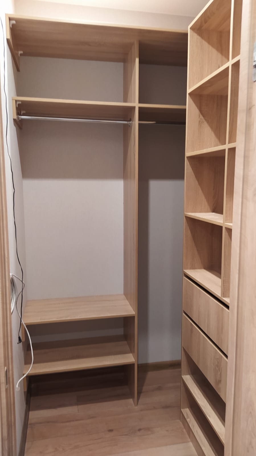 Функциональная гардеробная система в светлом древесном декоре. Продуманное сочетание открытых полок, штанг для плечиков и выдвижных ящиков обеспечивает удобное хранение одежды и обуви даже в компактном пространстве, поддерживая аккуратный порядок каждый день.