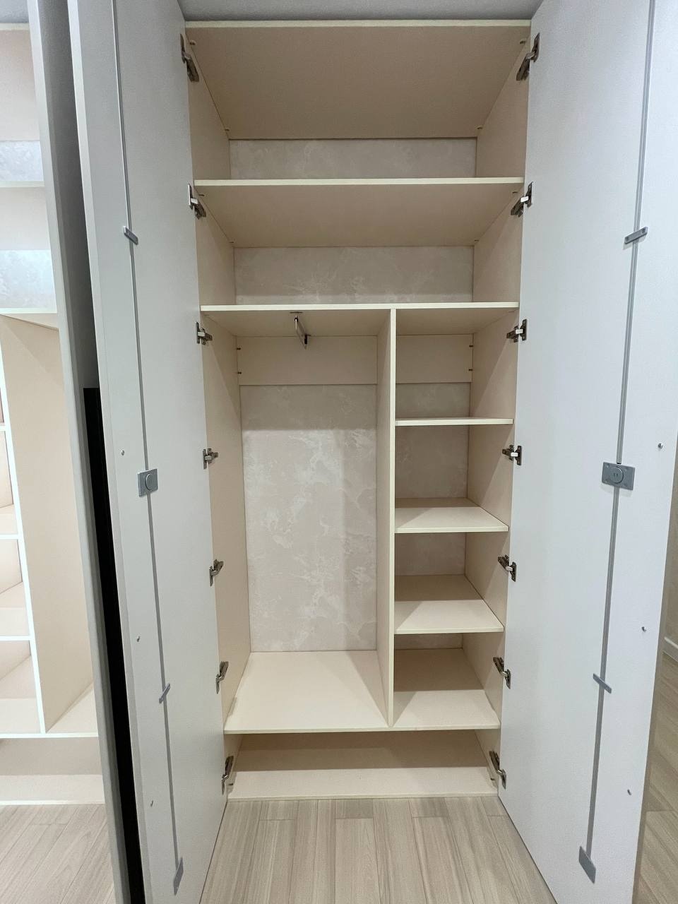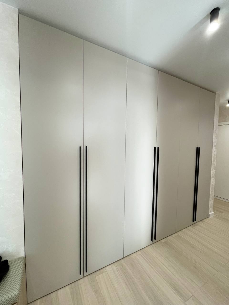 Просторный распашной шкаф во всю стену с лаконичными матовыми фасадами и высокими вертикальными ручками в контрастном тоне. Внутри предусмотрены открытые полки разной высоты, отделение со штангой для плечиков и вместительные ниши внизу, что обеспечивает удобное хранение одежды, обуви и аксессуаров в прихожей или спальне.