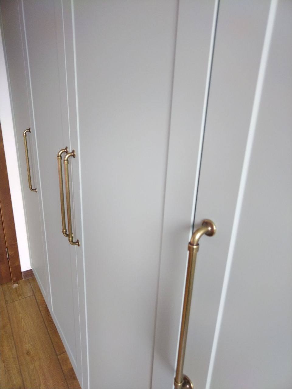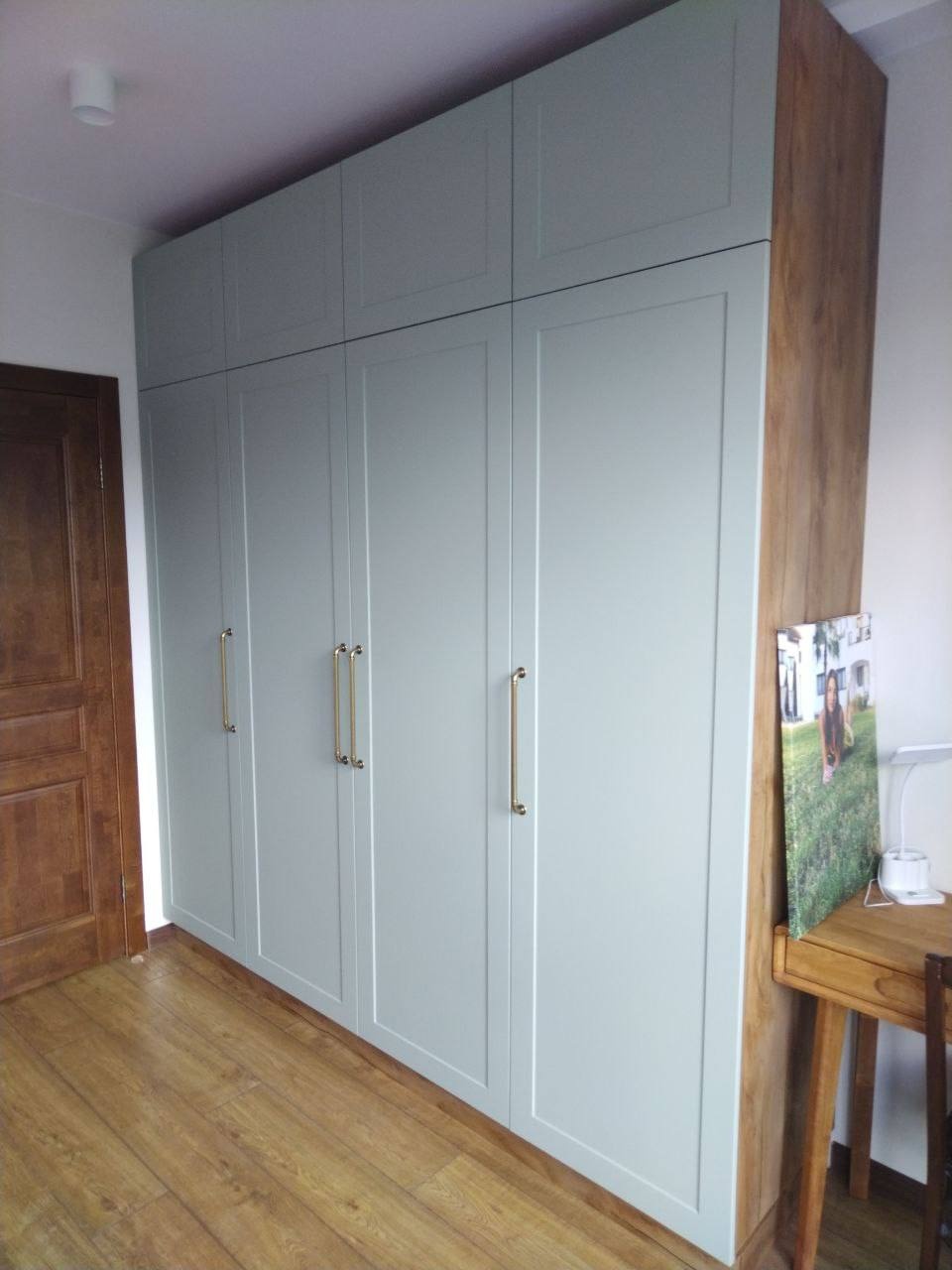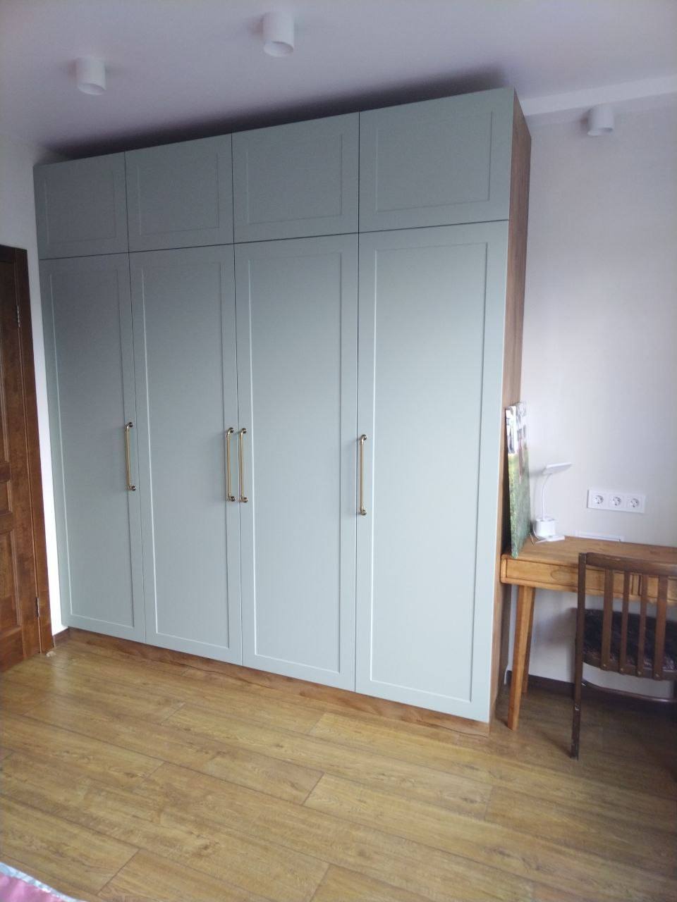 Вместительный распашной шкаф во всю высоту стены с классическими филенчатыми фасадами мягко‑серого оттенка и контрастным корпусом под натуральное дерево. Высокие металлические ручки в тёплом золотистом цвете придают модели элегантность, а продуманное внутреннее пространство обеспечивает удобное хранение одежды и текстиля.