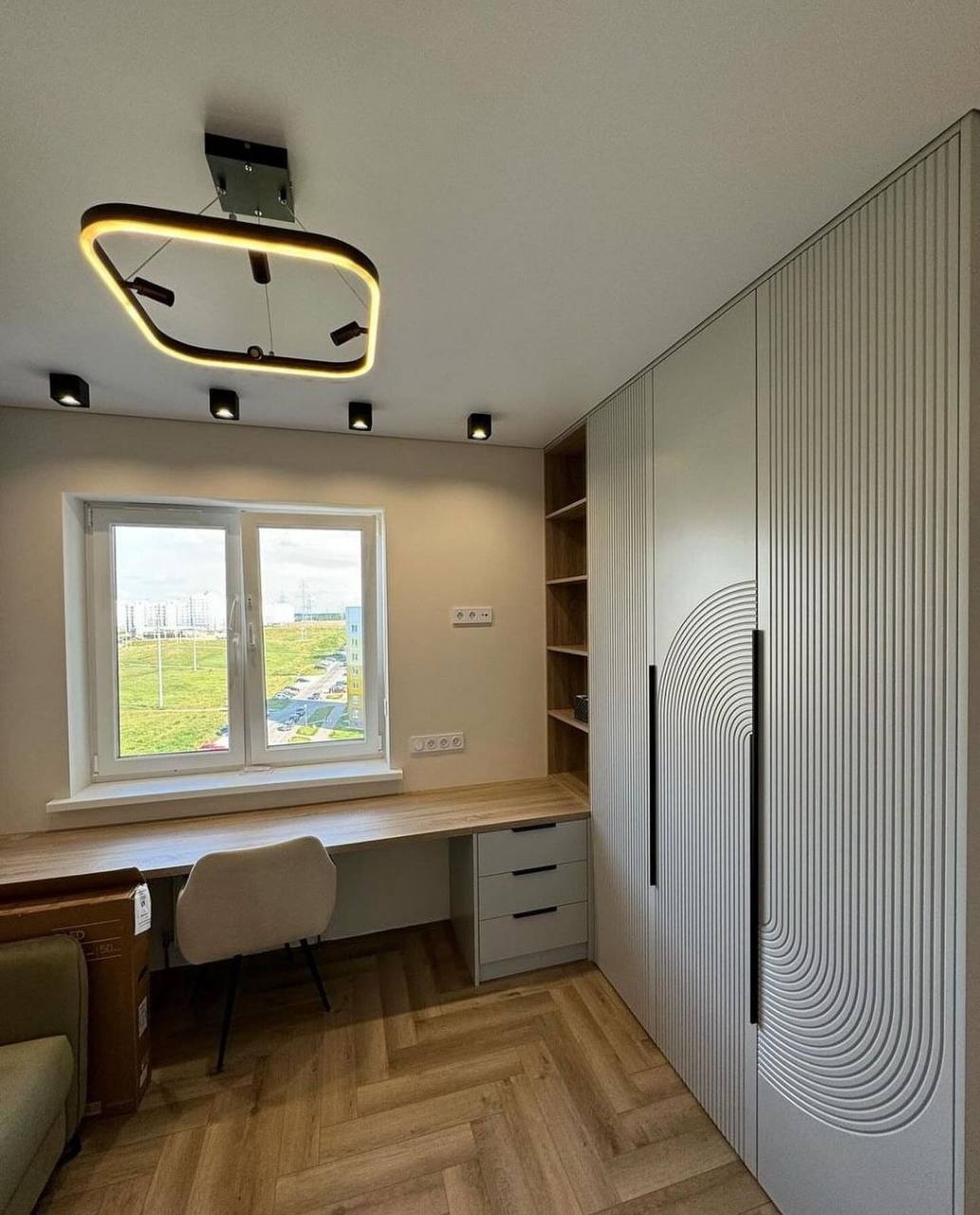 Современный распашной шкаф в светлом исполнении с фигурным рельефом фасадов и высокими вертикальными ручками. Встроенный открытый стеллаж из теплого дерева и примыкающий рабочий стол создают функциональную зону хранения и работы. Лаконичный дизайн легко впишется в минималистичный интерьер спальни или кабинета.