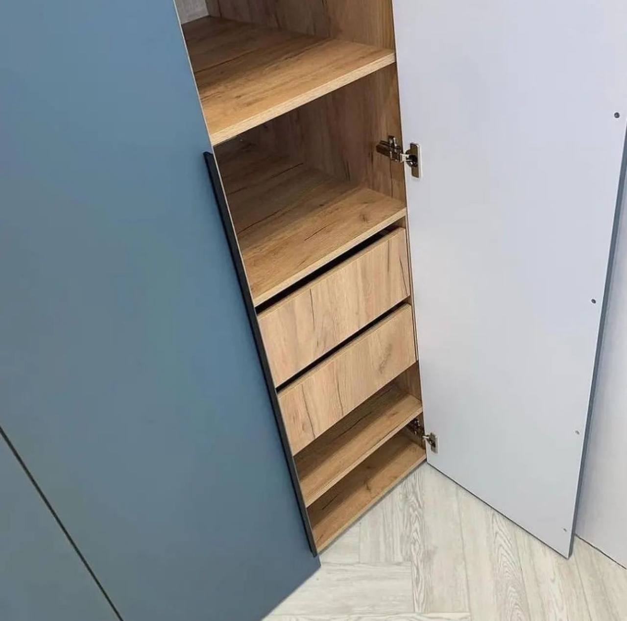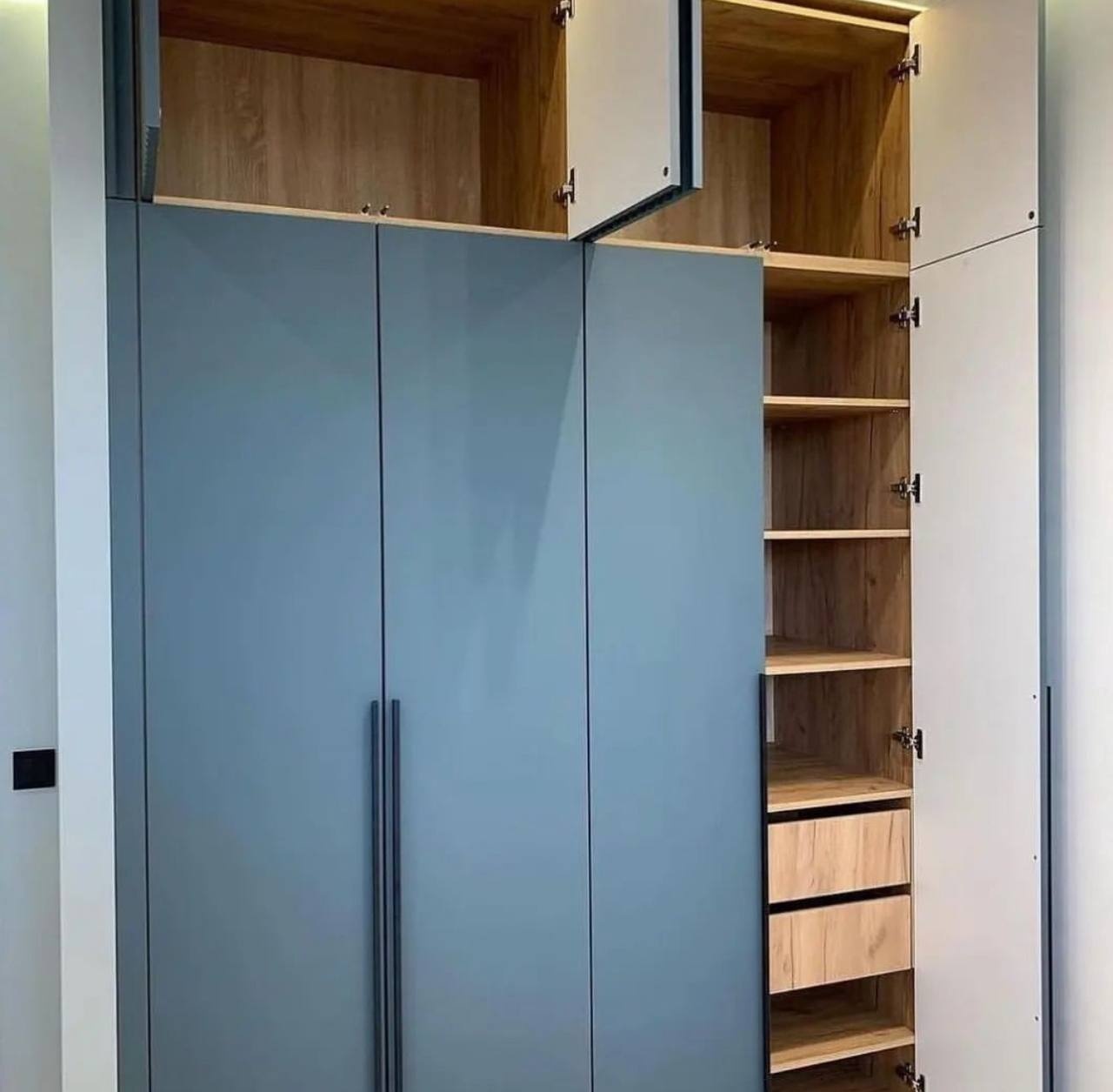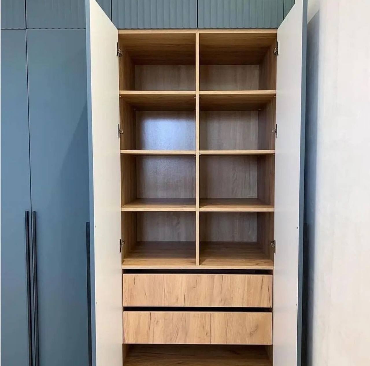Вместительный распашной шкаф с высокими матовыми фасадами в современном оттенке серо-синего. Внутреннее пространство выполнено под натуральное дерево и включает множество полок и выдвижных ящиков для удобной организации одежды и текстиля. Лаконичные вертикальные ручки подчеркивают минималистичный дизайн.