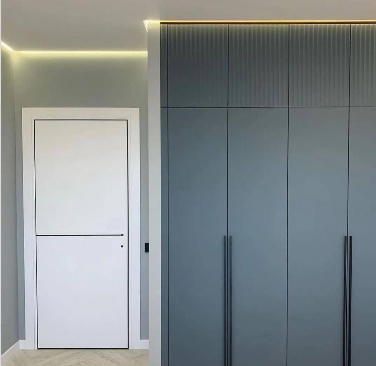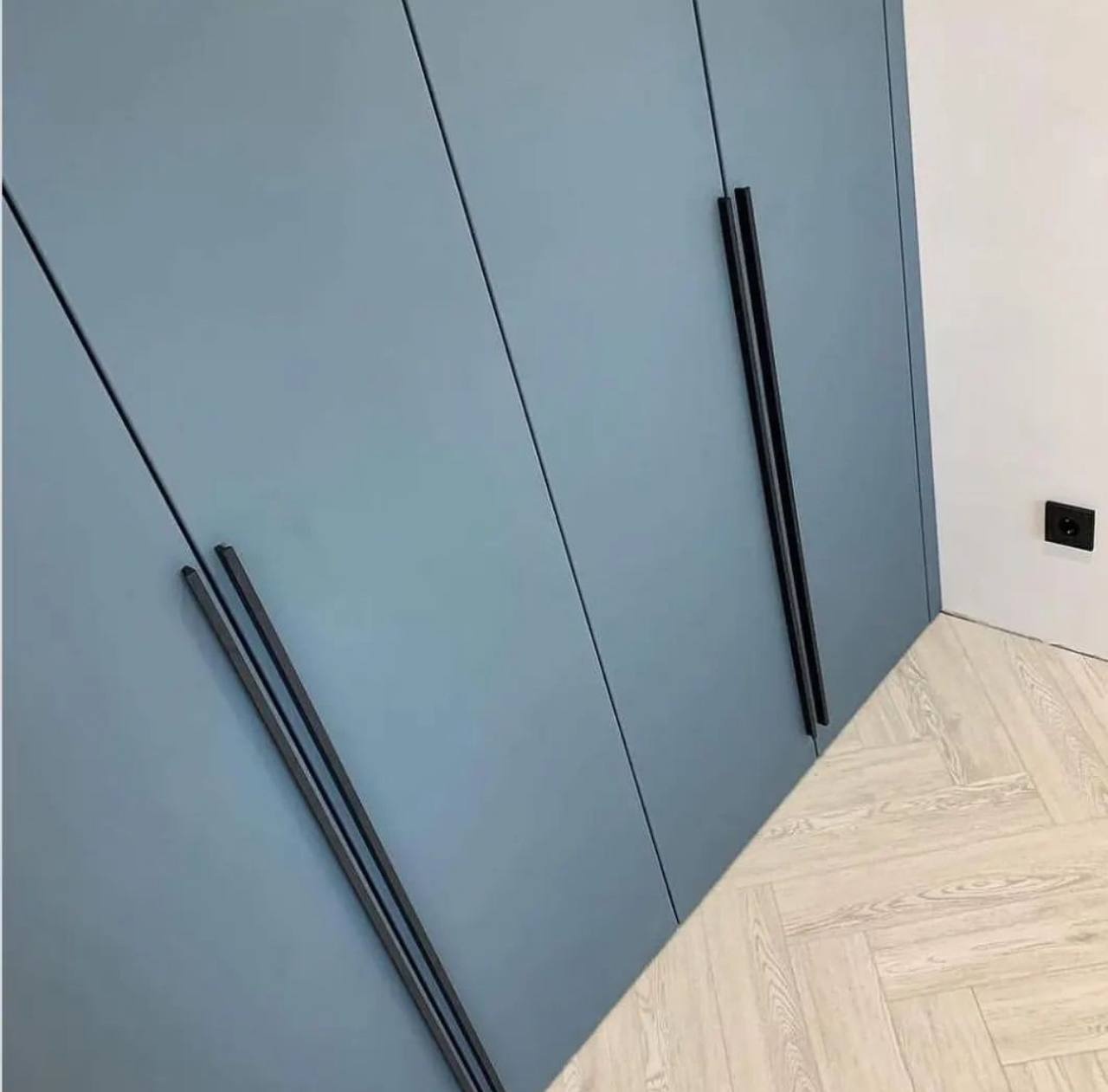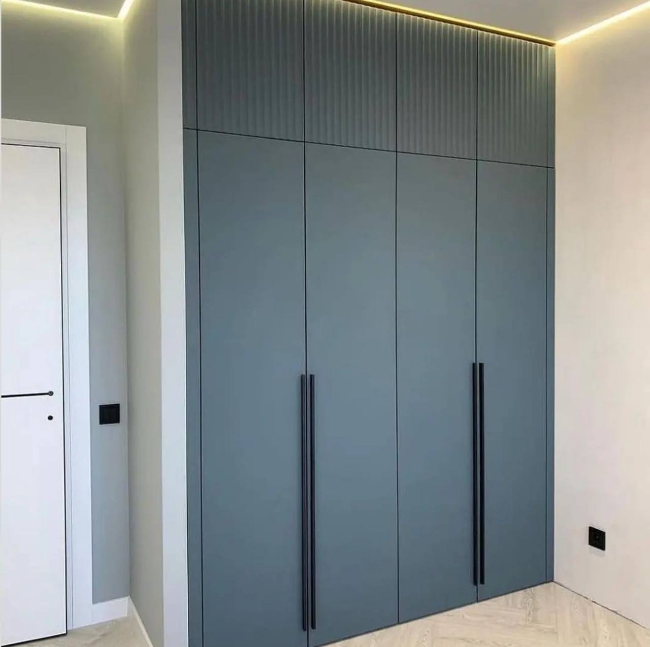 Вместительный распашной шкаф с высокими матовыми фасадами в современном оттенке серо-синего. Внутреннее пространство выполнено под натуральное дерево и включает множество полок и выдвижных ящиков для удобной организации одежды и текстиля. Лаконичные вертикальные ручки подчеркивают минималистичный дизайн.