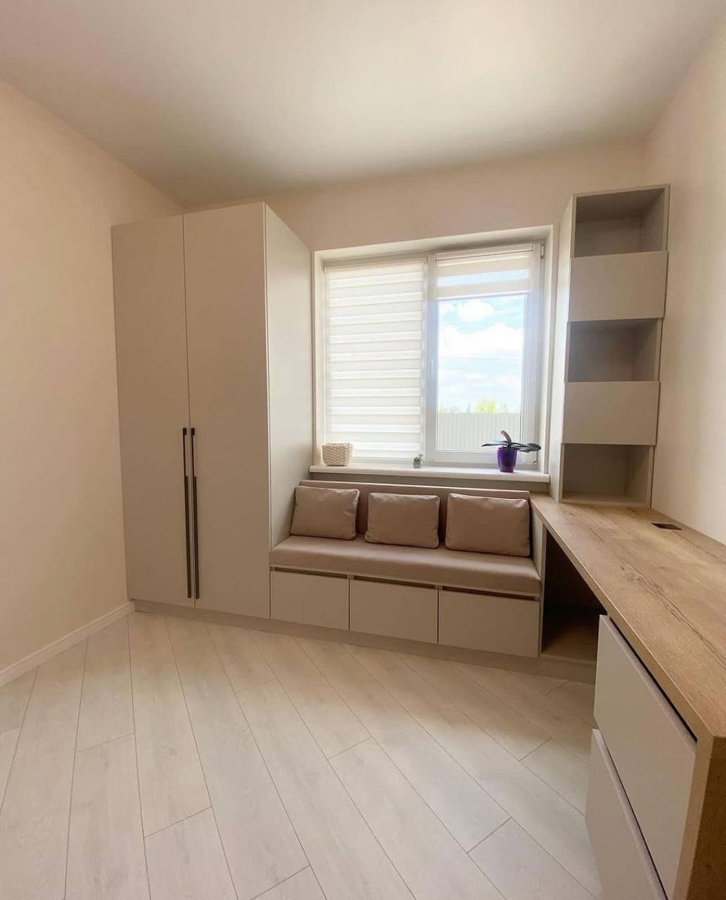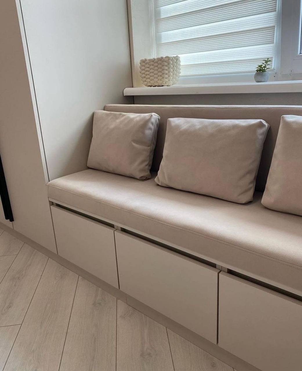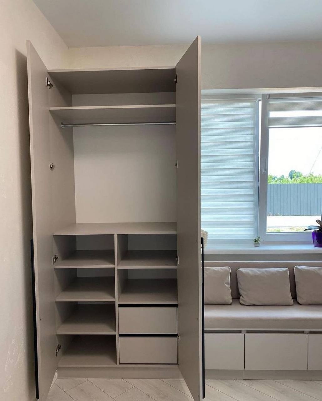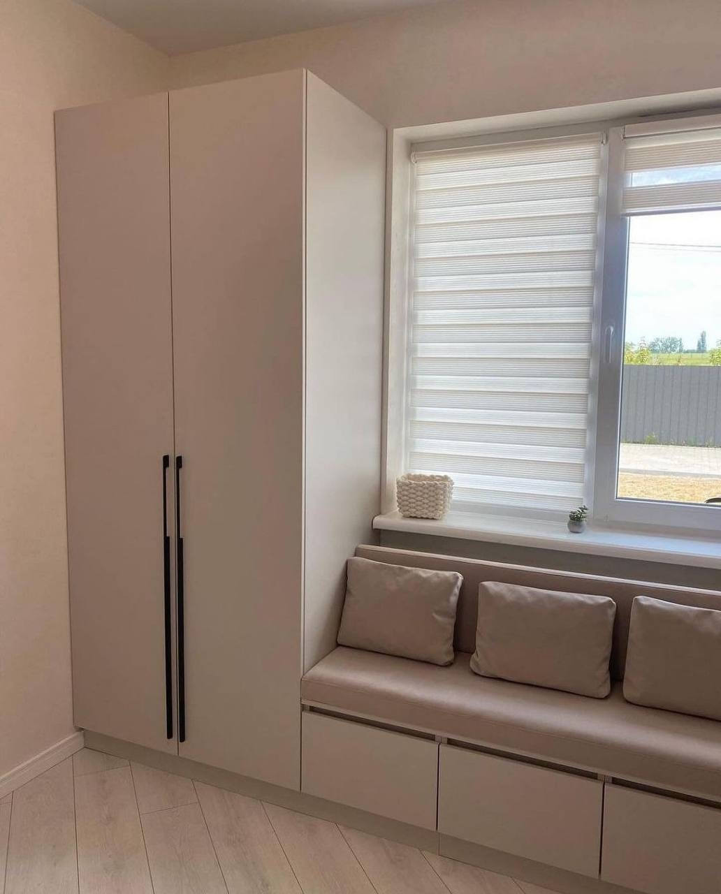 Лаконичный распашной шкаф в светлых тонах объединён с удобным сиденьем у окна и нижними выдвижными модулями. Высокие глухие фасады с вертикальными ручками создают аккуратный объём для хранения одежды и текстиля, а мягкая скамья с подушками и нишами под ней рационально использует пространство небольшой комнаты.
