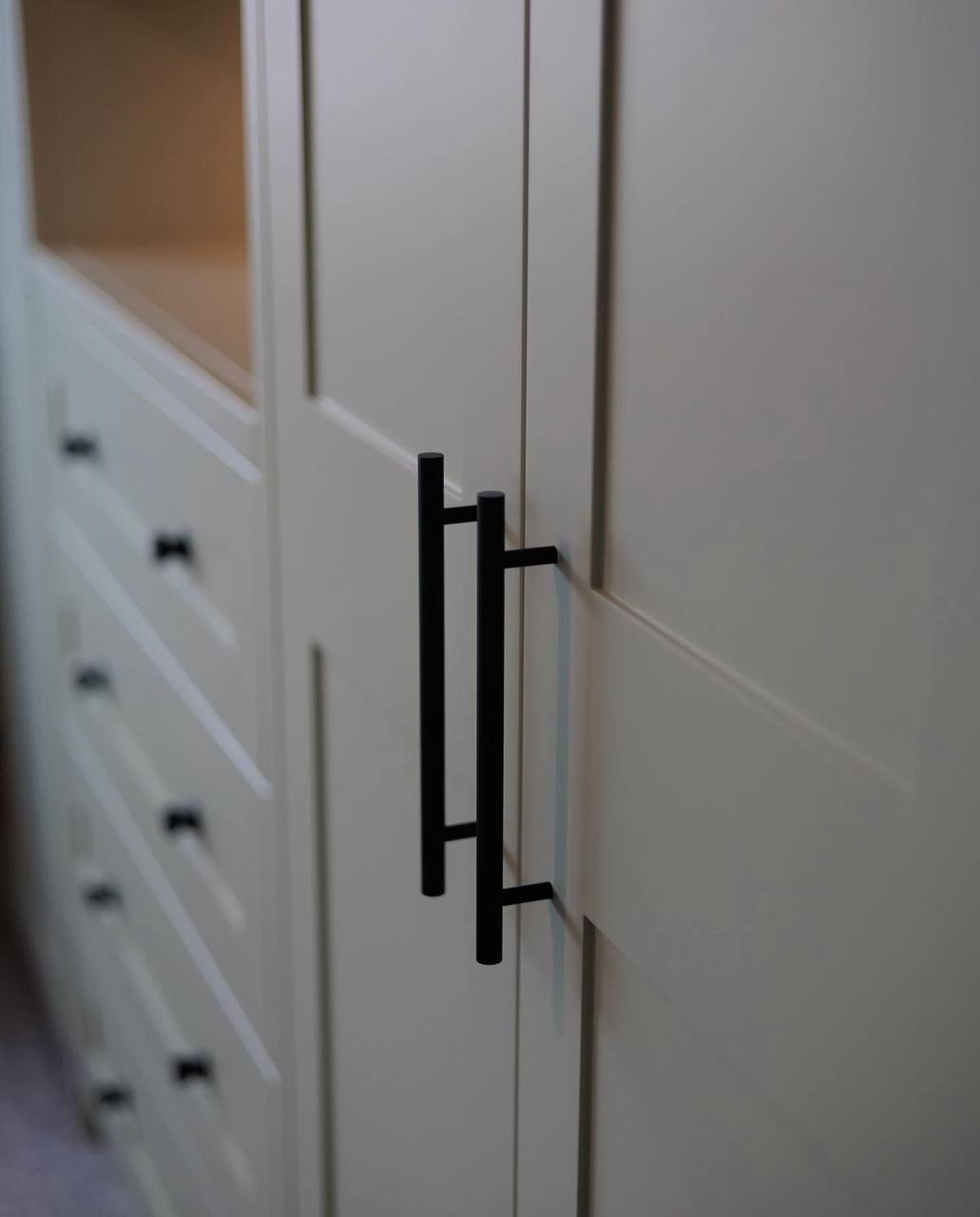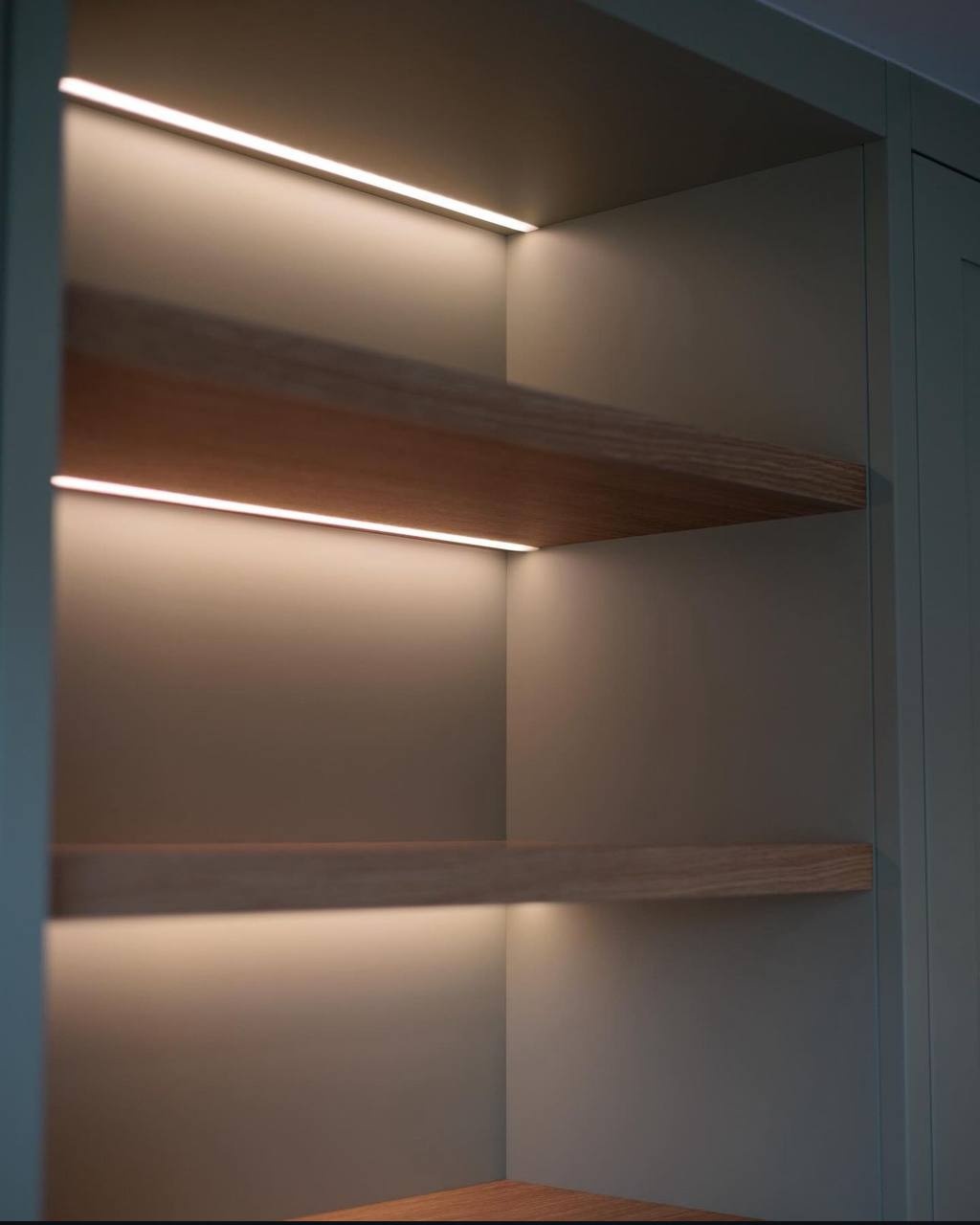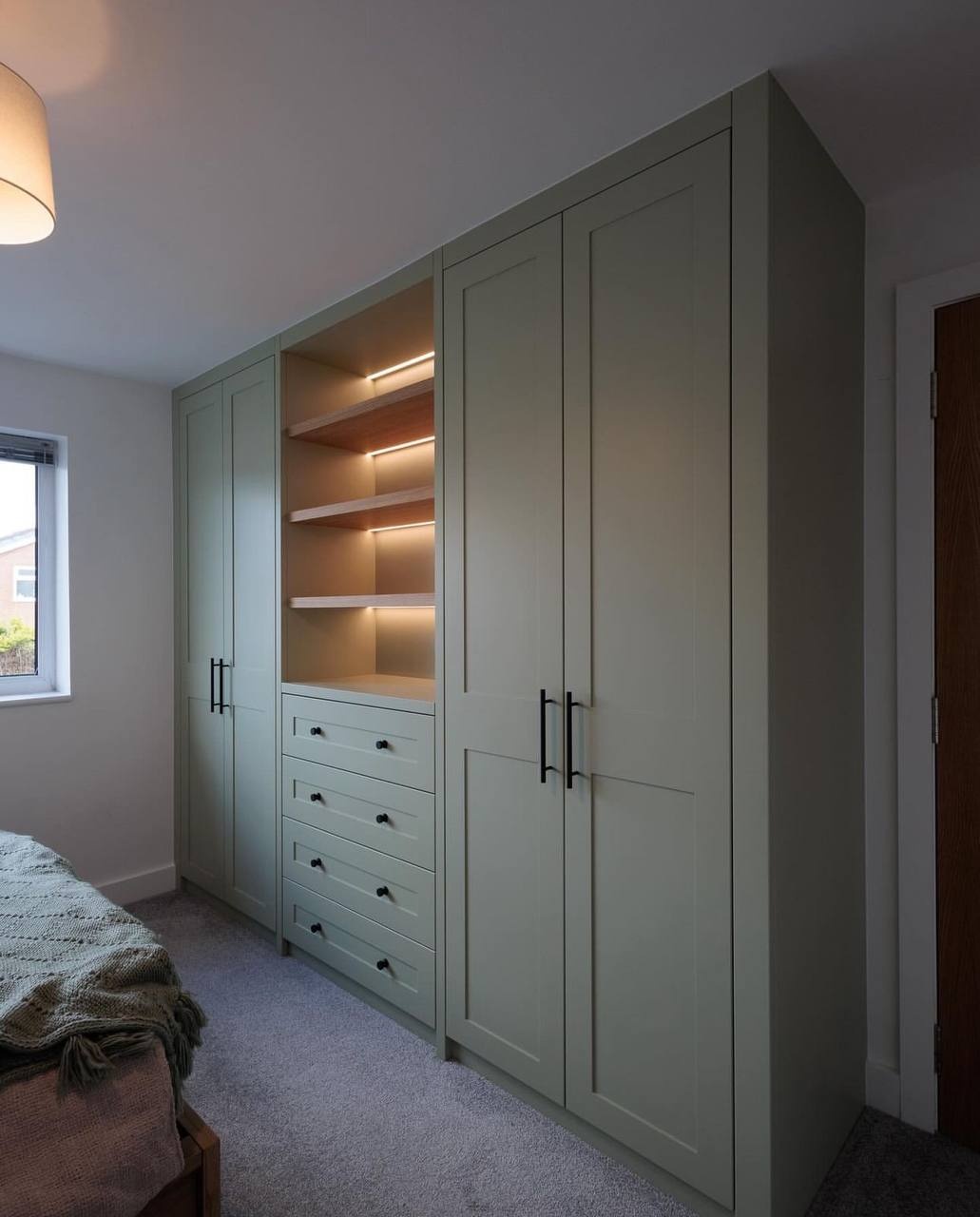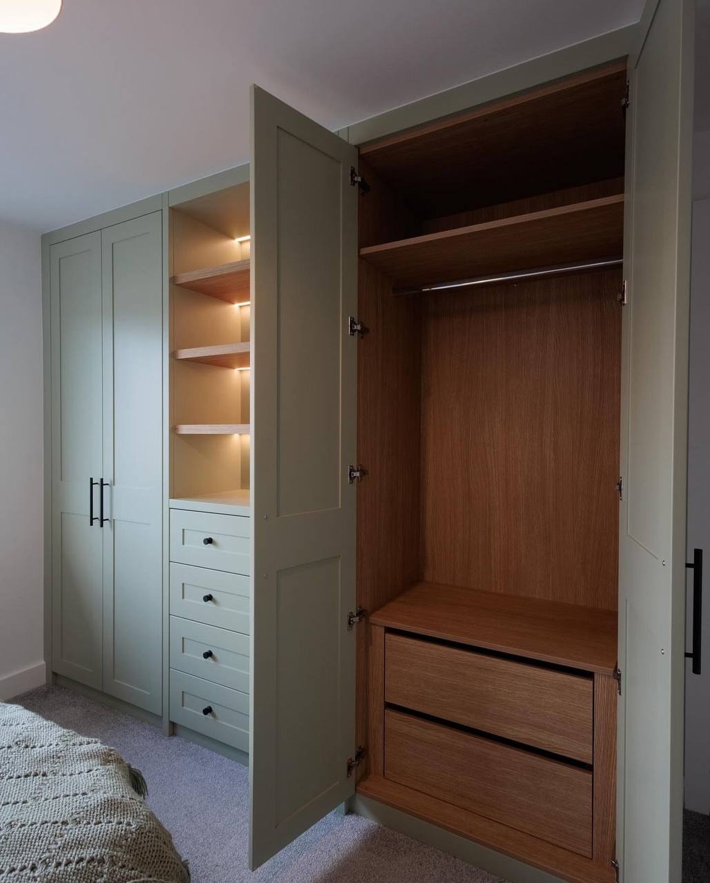Функциональный распашной шкаф в спокойном матовом оттенке с акцентом на открытые полки с встроенной LED-подсветкой. Внутреннее наполнение из тёплого дерева включает штангу для одежды, вместительные выдвижные ящики и верхние полки. Идеальное решение для спальни, где важно аккуратное хранение и уютная атмосфера.