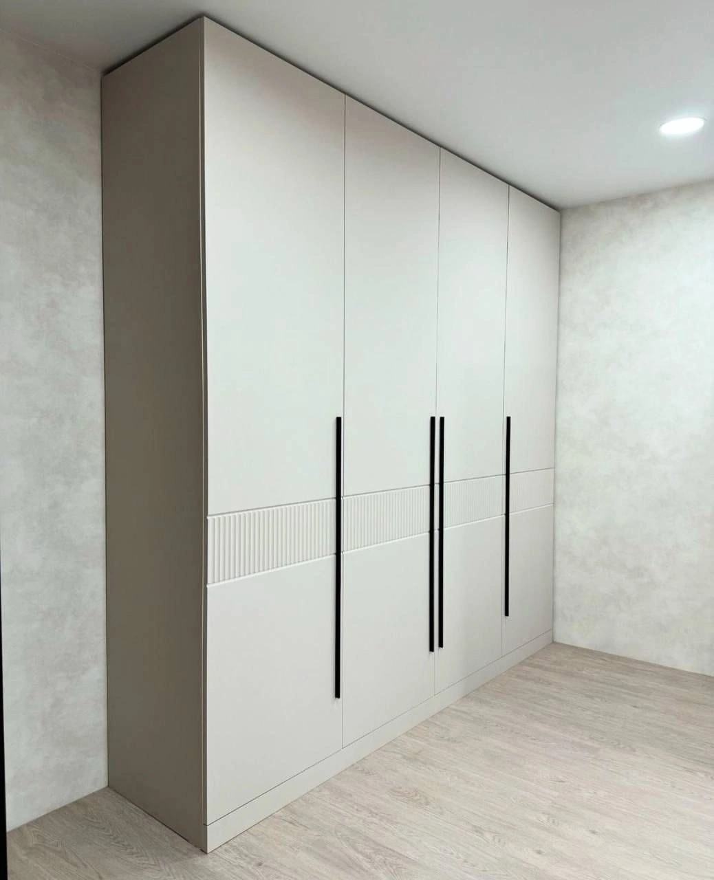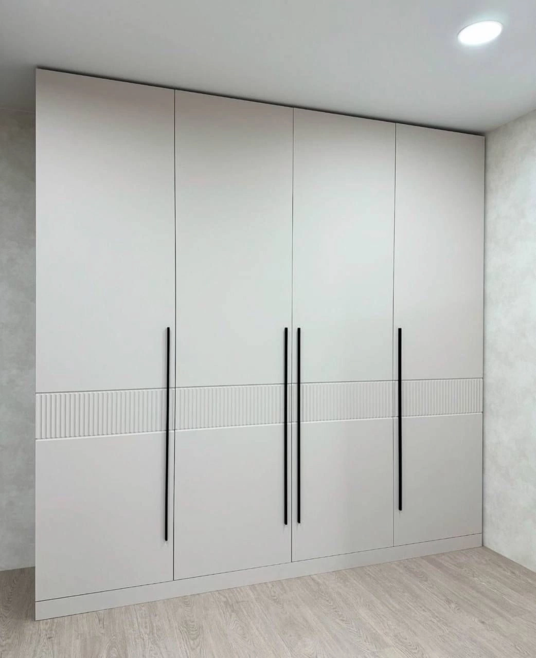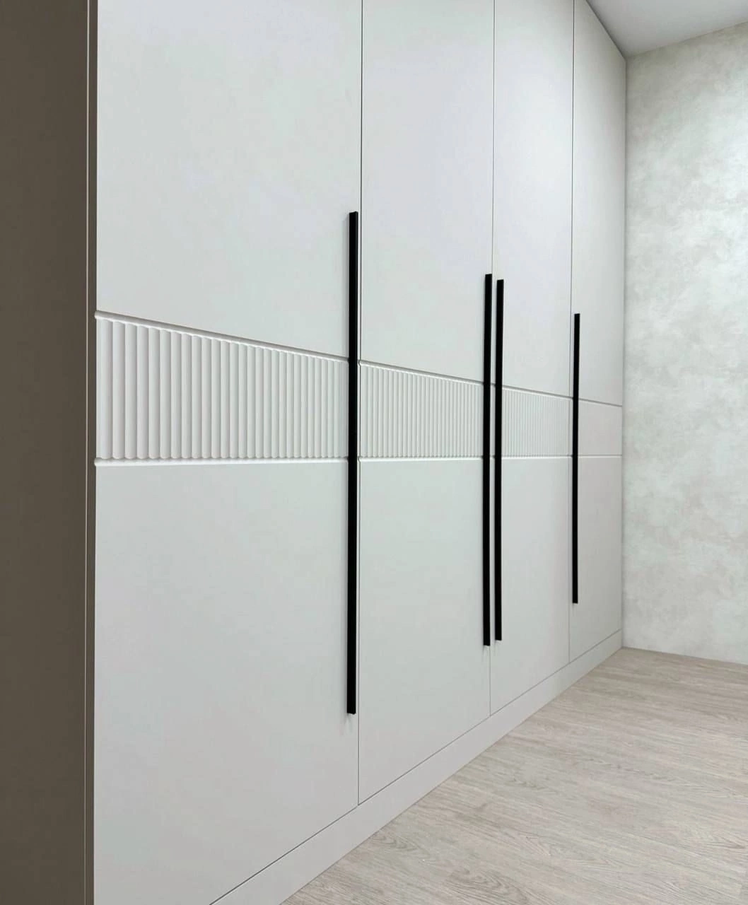 Вместительный распашной шкаф во всю стену с лаконичными светлыми фасадами и выразительными черными ручками-релингами. Внутри предусмотрены штанги для одежды, открытые полки и выдвижные ящики для белья и аксессуаров. Горизонтальная рельефная вставка придает дизайну динамику и подчеркивает современный стиль интерьера.