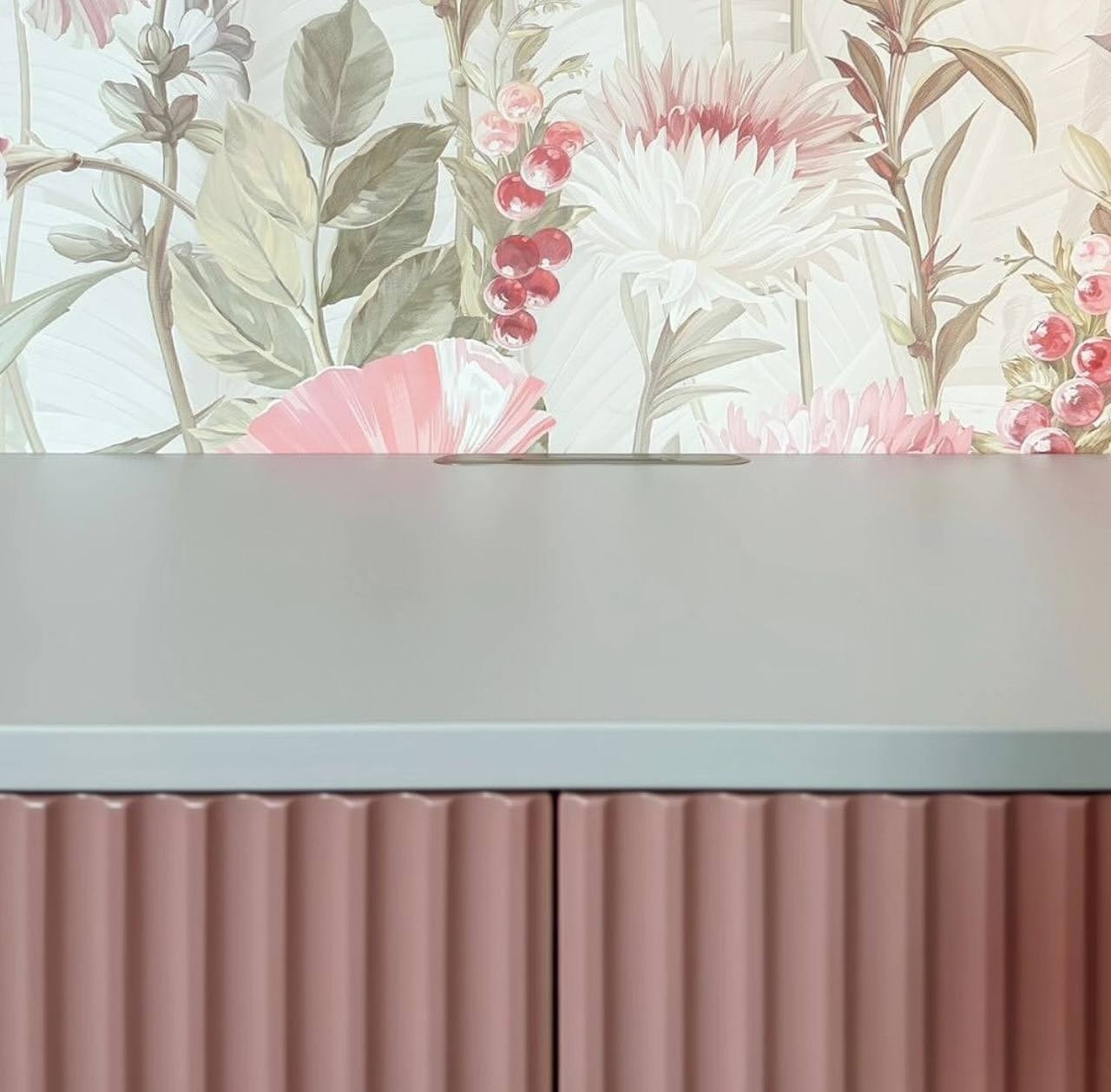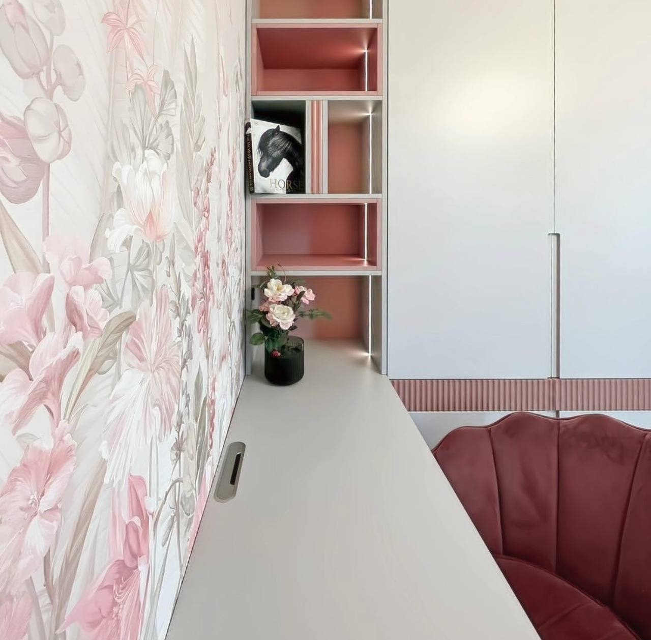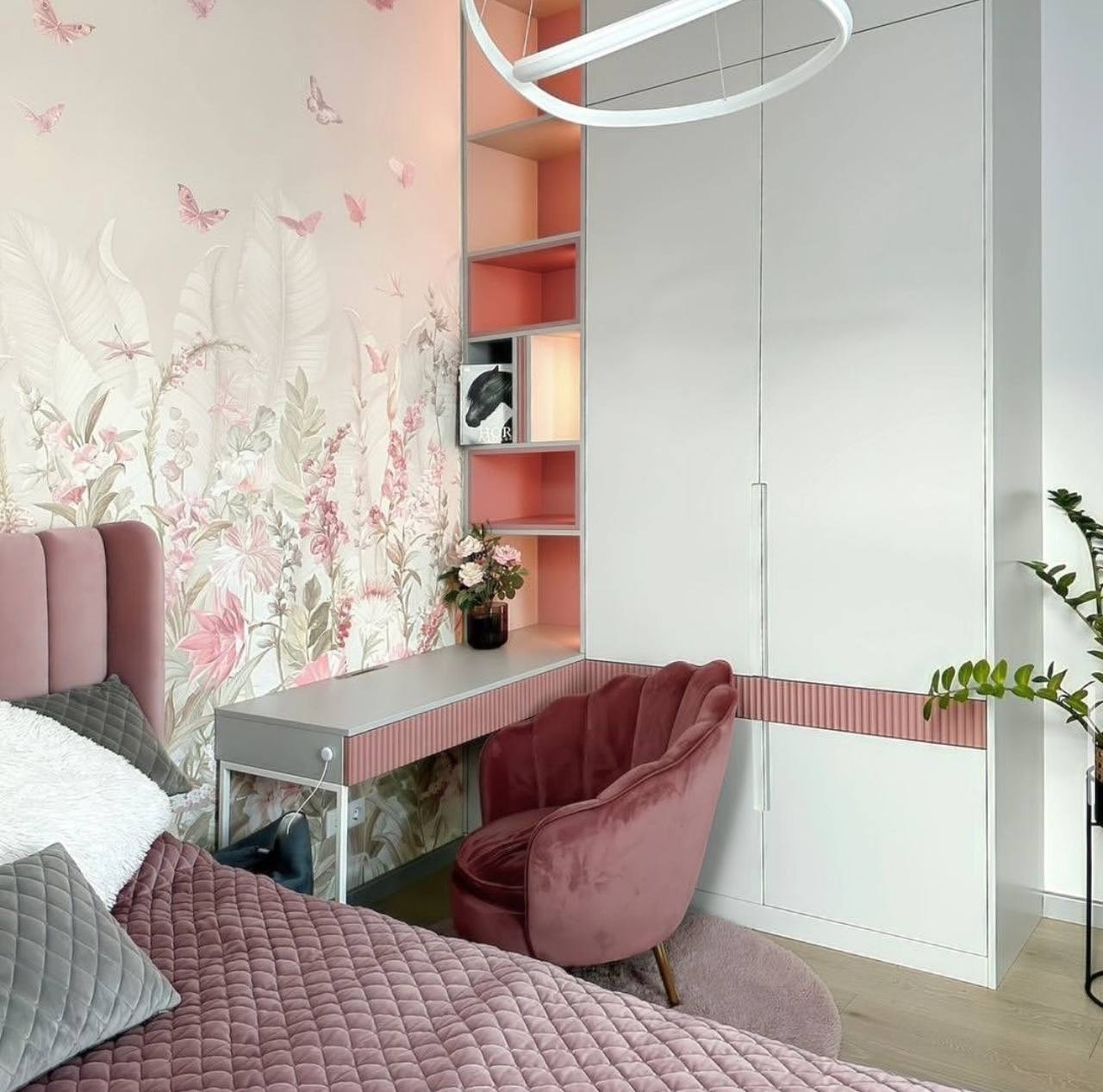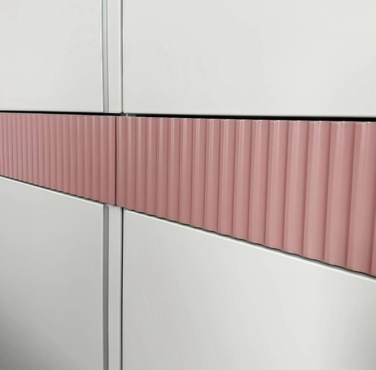 Элегантный распашной шкаф в светлых тонах с акцентной розовой вставкой и фактурными вертикальными рейками. Встроенное рабочее место с письменным столом образует единый композиционный блок, а открытые стеллажи с подсветкой добавляют лёгкости и функциональности. Идеальное решение для современной спальни или детской комнаты.