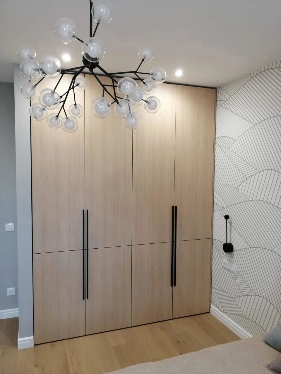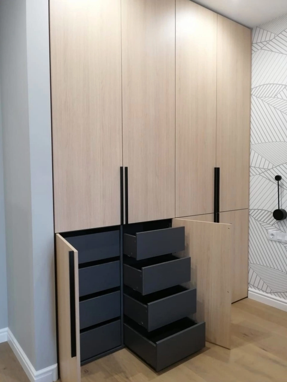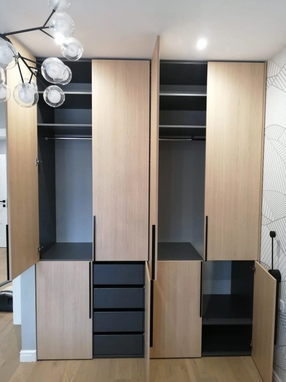 Вместительный распашной шкаф во всю высоту стены выполнен в отделке под светлое дерево с контрастной темной внутренней частью и вертикальными черными ручками. Внутри предусмотрены штанги для одежды, открытые полки и модуль с выдвижными ящиками, что обеспечивает удобную организацию хранения в спальне или гардеробной.