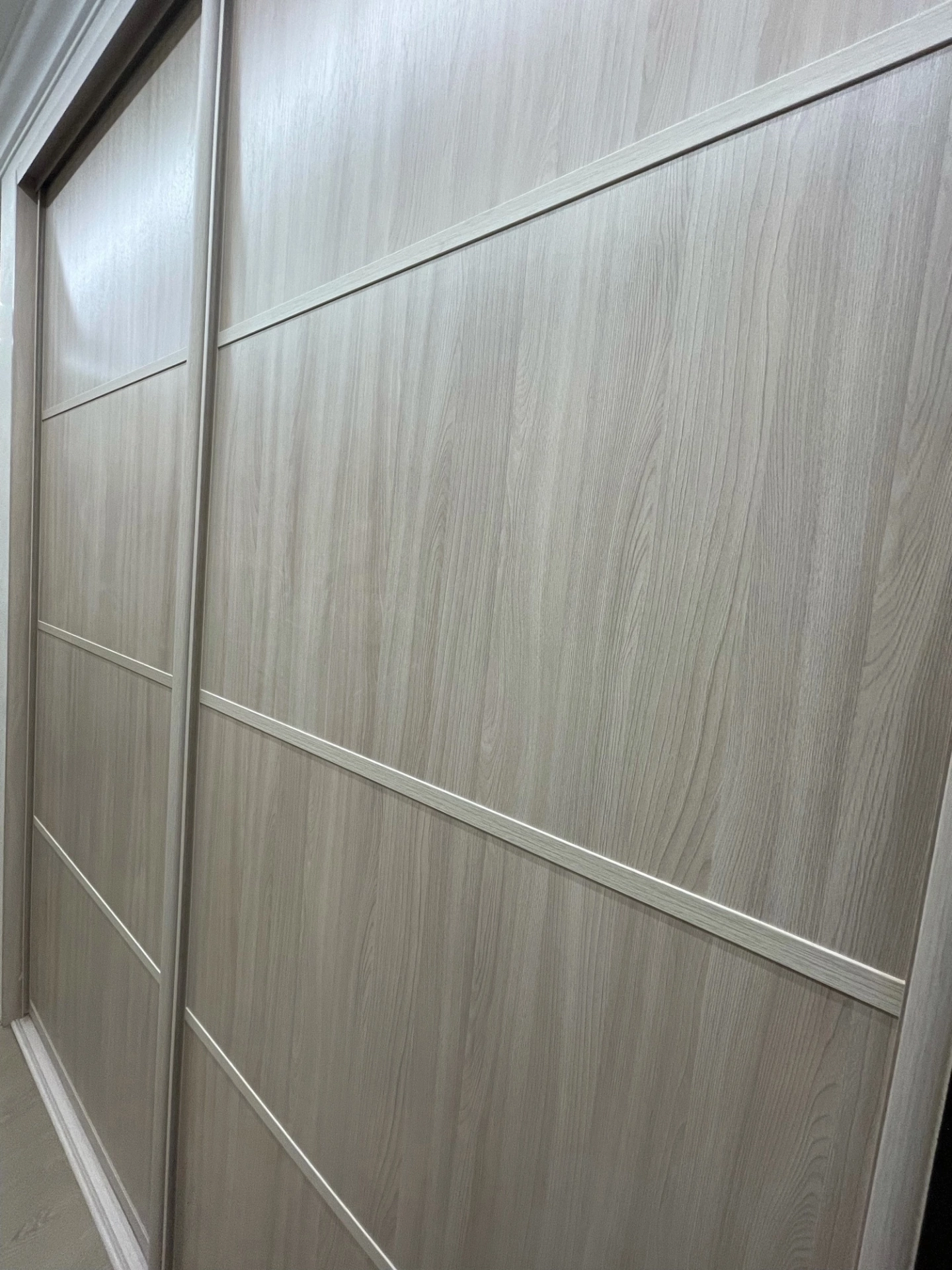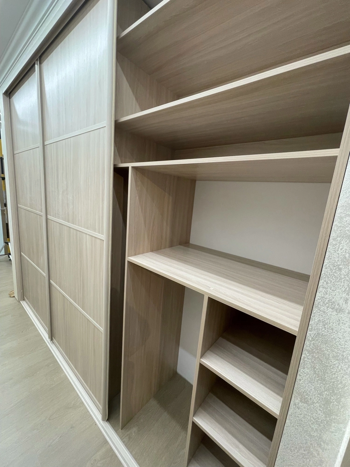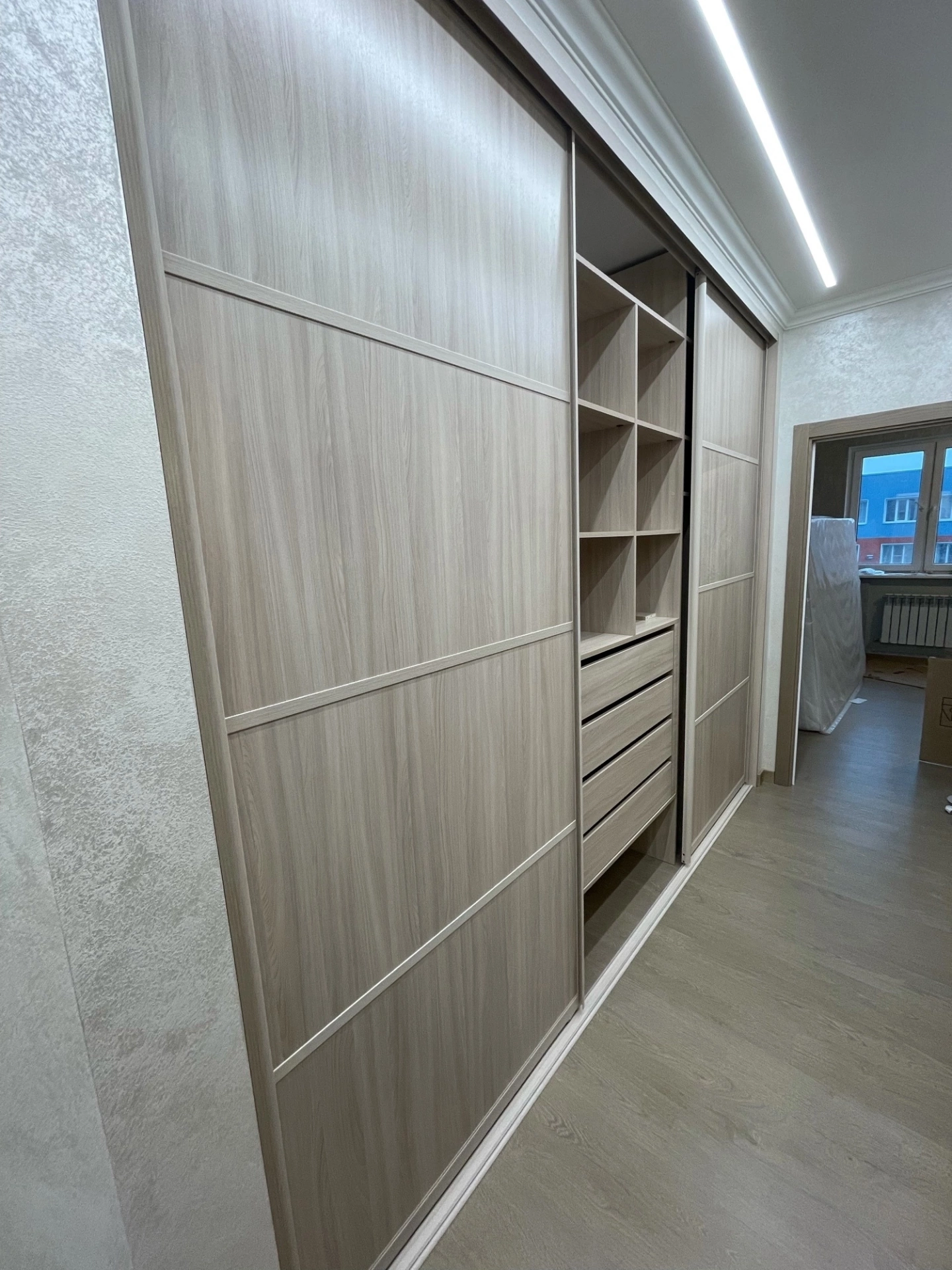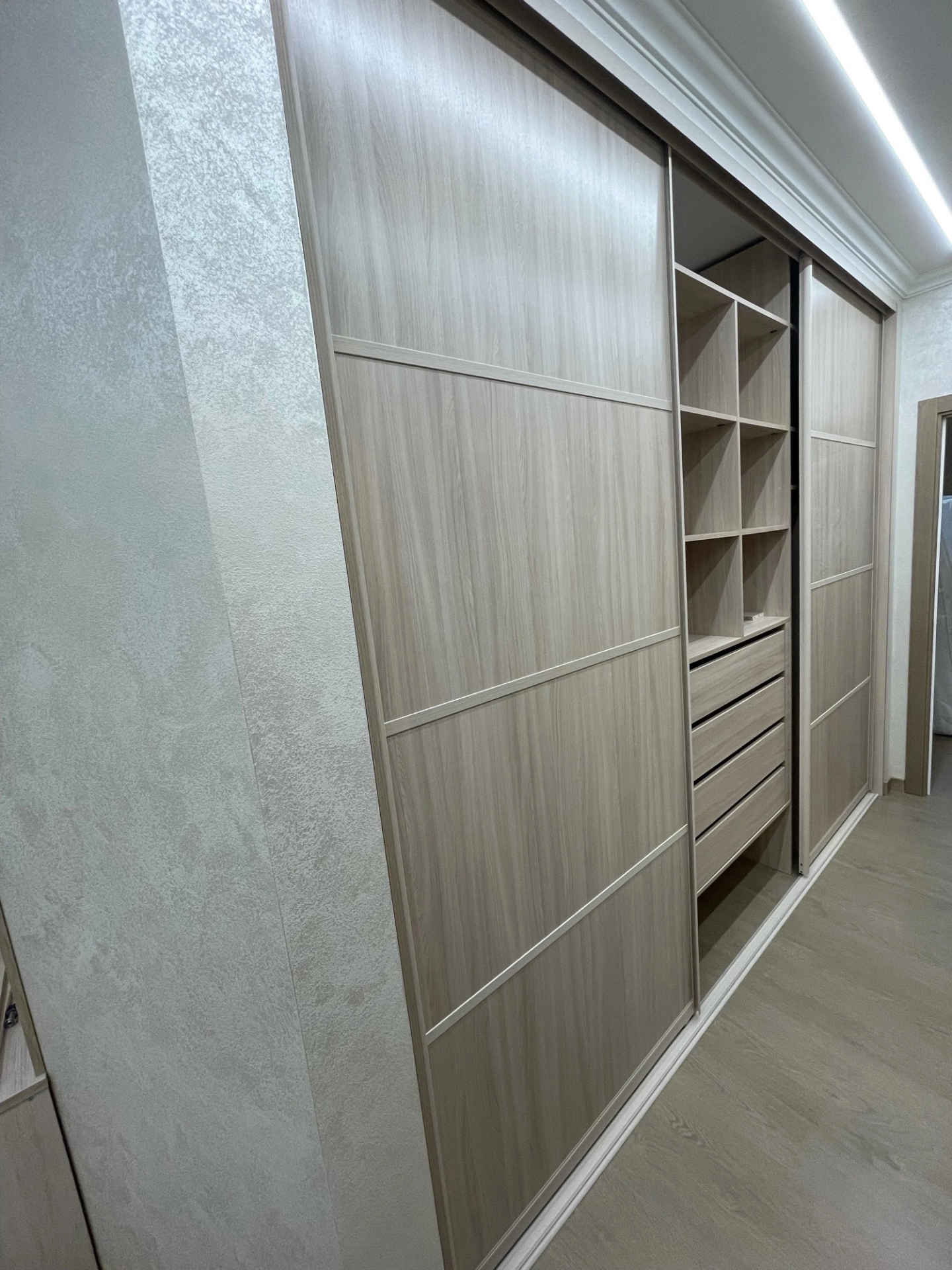 Функциональный шкаф-купе в отделке под светлый дуб сочетает просторные закрытые отделения со сдвижными дверями и продуманное внутреннее наполнение. Открытые полки разной высоты, удобные выдвижные ящики и ниша для вешалок обеспечивают аккуратное хранение одежды, обуви и аксессуаров в спальне или прихожей.