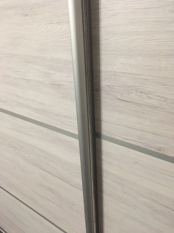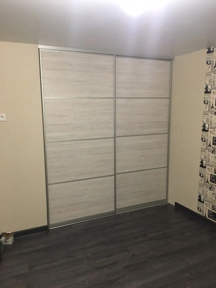 Вместительный шкаф-купе с фасадами под беленый дуб и аккуратным алюминиевым профилем гармонично вписывается в современный интерьер. Внутри предусмотрены открытые полки, выдвижные ящики и две штанги для одежды, что обеспечивает удобное хранение как повседневных вещей, так и сезонного гардероба, освобождая пространство комнаты.