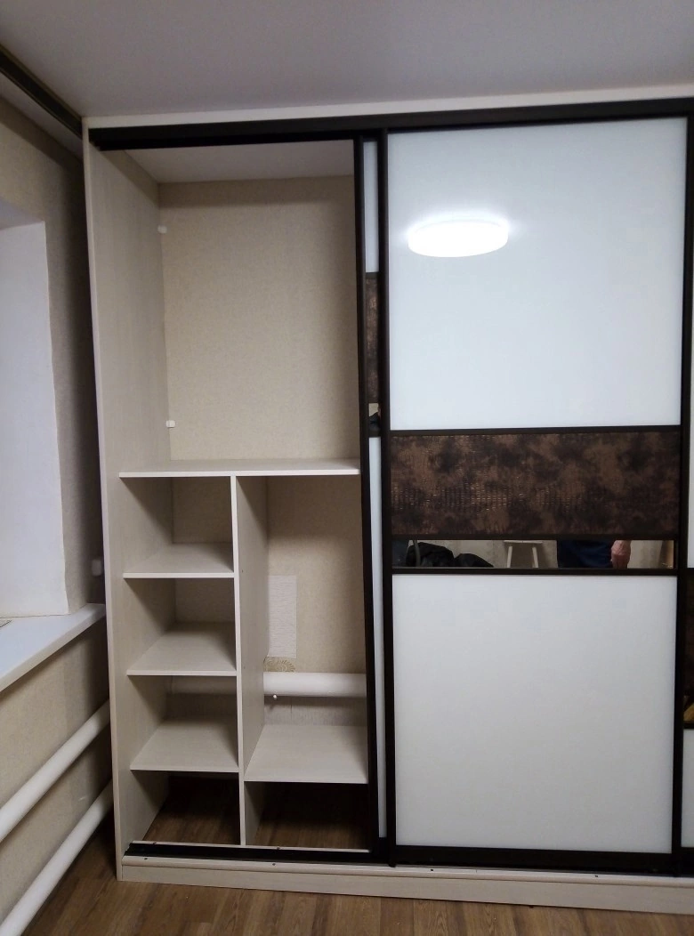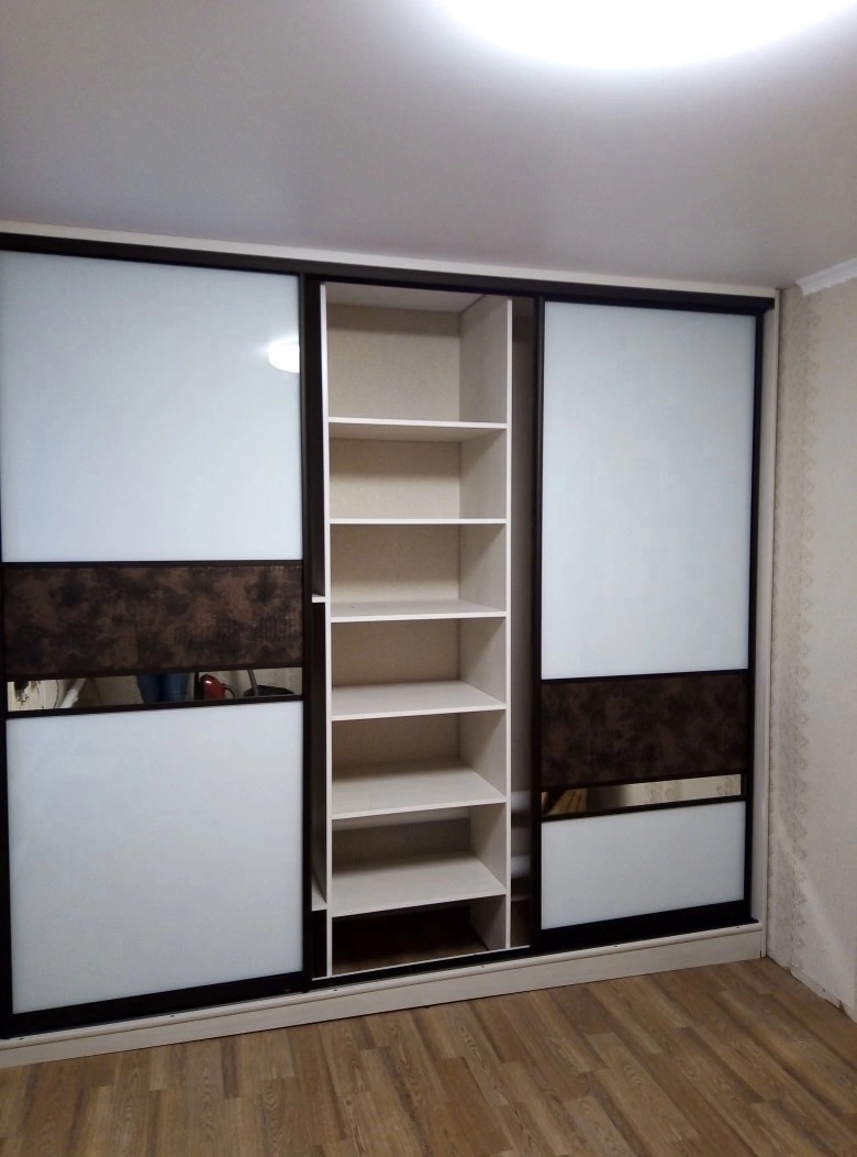 Стильный трёхдверный шкаф-купе с матовыми белыми фасадами, контрастными коричневыми вставками и узкими зеркальными полосами. Внутри предусмотрены открытые полки, секции под одежду и вместительные ниши для хранения. Универсальное решение для спальни или прихожей, позволяющее рационально использовать пространство стены.