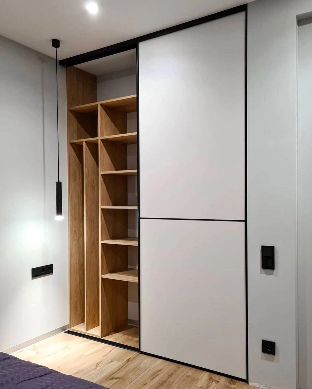 Современный шкаф-купе с гладкими белыми фасадами в тонком черном обрамлении и контрастным внутренним наполнением из теплого дерева. Открытые полки разной высоты позволяют удобно разместить одежду, книги и декор, а раздвижные двери экономят пространство и поддерживают аккуратный, минималистичный вид комнаты.
