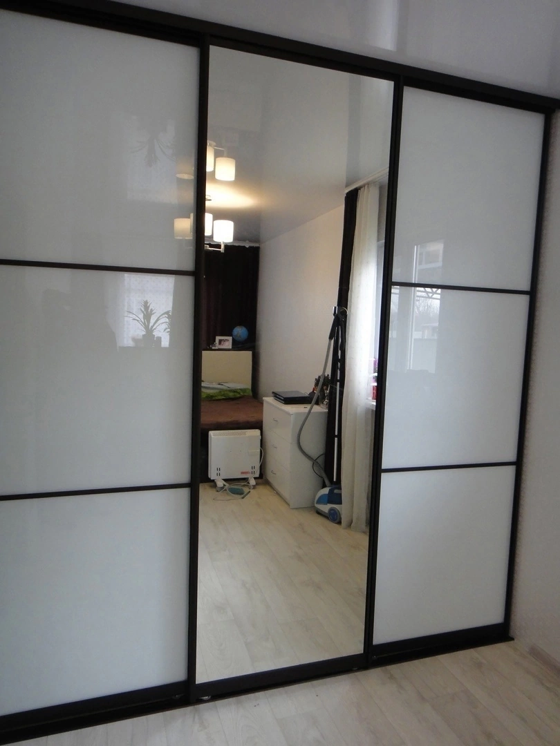 Современный шкаф-купе с тремя раздвижными фасадами: центральная дверь выполнена из зеркала во весь рост, боковые — из гладких белых панелей в темном алюминиевом профиле. Внутри предусмотрена система открытых полок для удобного размещения одежды, белья и аксессуаров. Лаконичный дизайн визуально расширяет пространство и подходит к любому интерьеру спальни или прихожей.