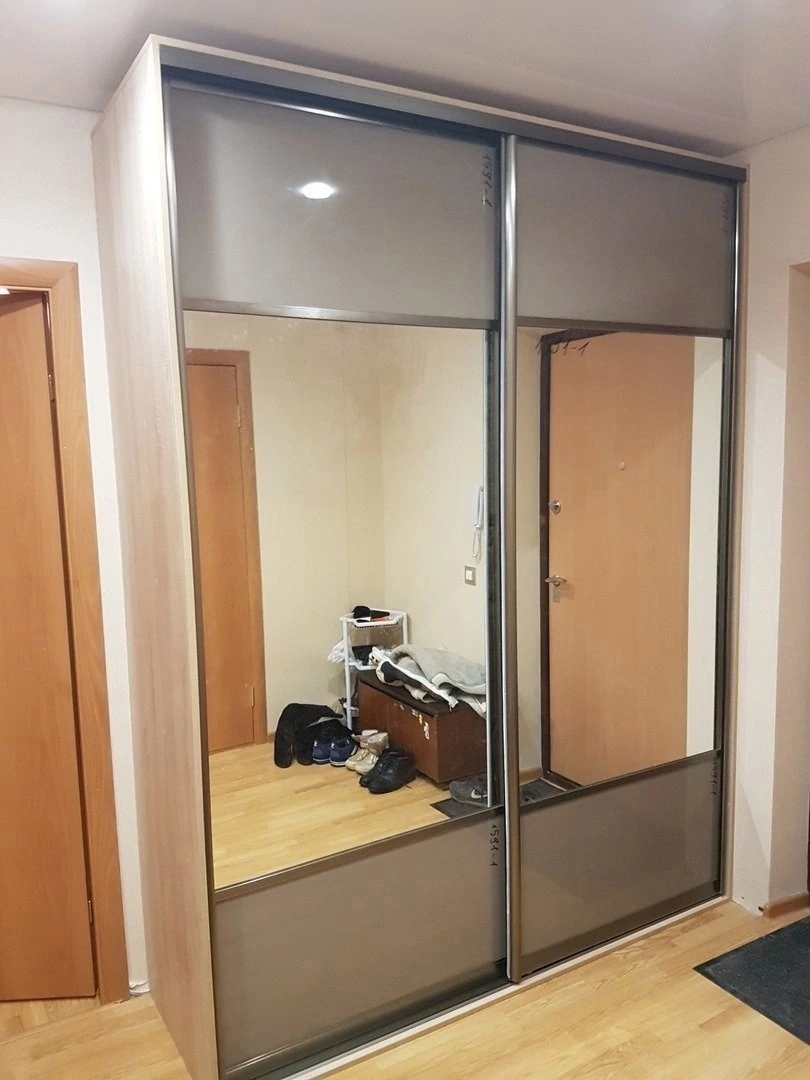 Функциональный шкаф-купе для прихожей с корпусом из светлого дерева и раздвижными дверями с зеркальными и глянцевыми вставками визуально расширяет пространство и освещает комнату. Внутри предусмотрены открытые полки, выдвижные ящики, отделение для верхней одежды и вместительные сетчатые корзины для обуви и аксессуаров.