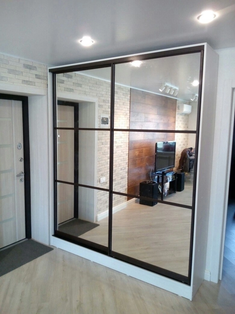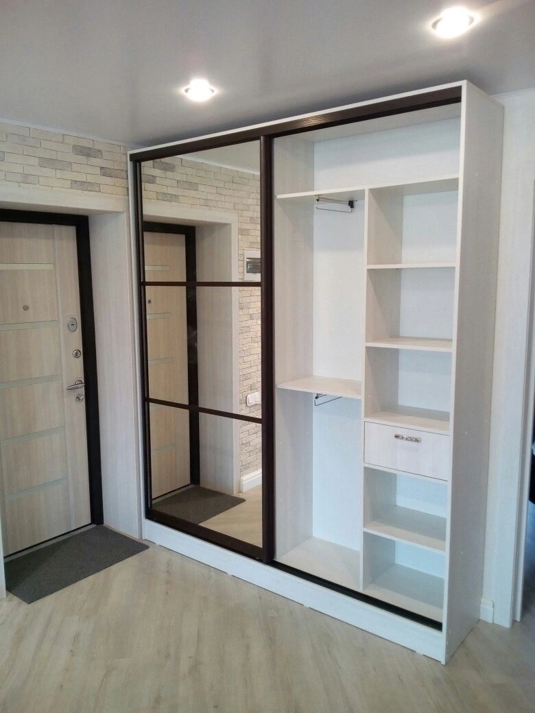 Функциональный шкаф-купе для прихожей с крупными зеркальными фасадами в темном профиле визуально расширит пространство и добавит света. Внутри предусмотрены секция с перекладиной для верхней одежды, полки для обуви и аксессуаров, выдвижной ящик, а также открытая зона с крючками для повседневных вещей.