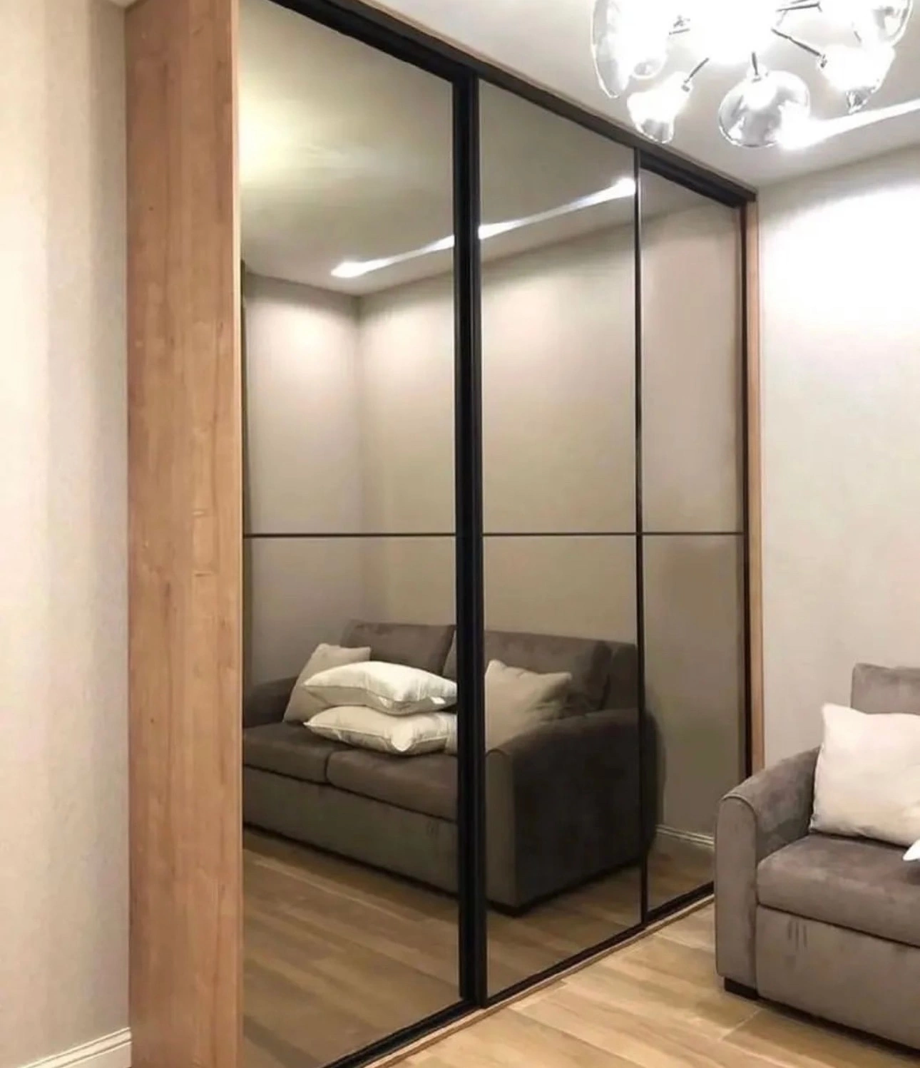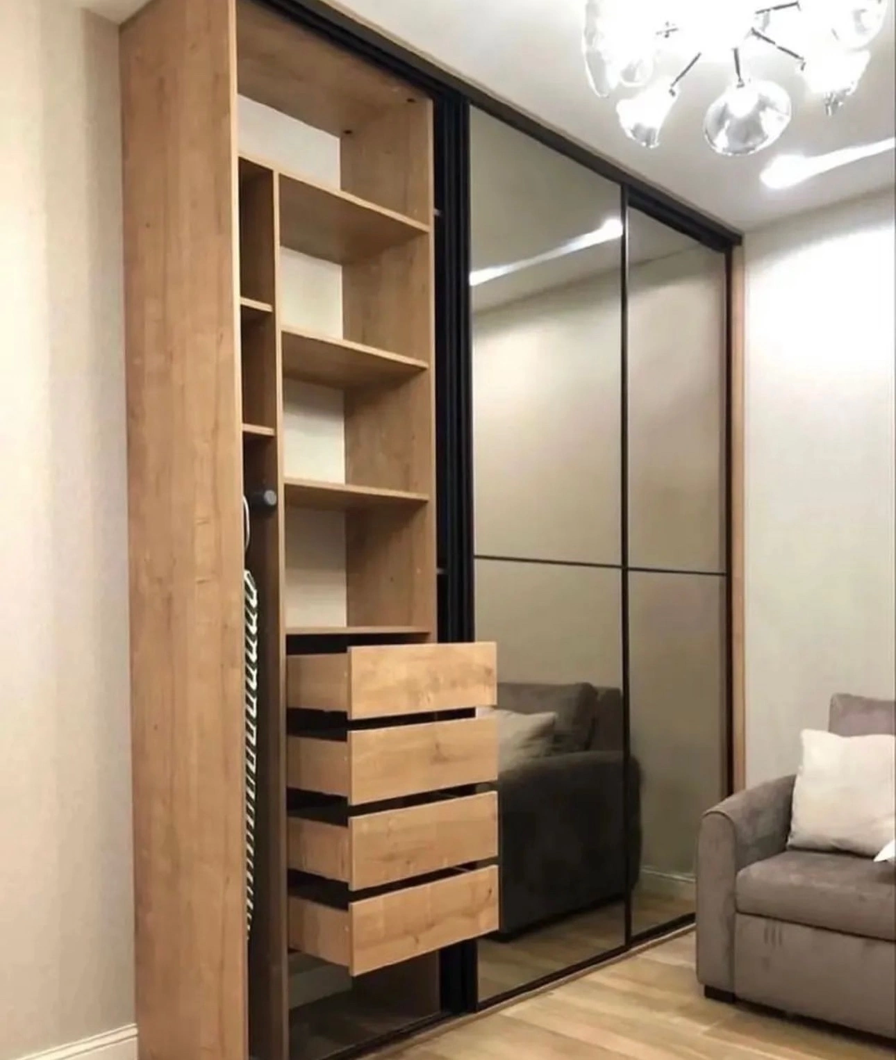 Современный шкаф-купе с крупными зеркальными фасадами визуально расширяет пространство и добавляет свет в комнату. Внутреннее наполнение включает выдвижные ящики, открытые полки и отделение для вещей на вешалках. Теплый древесный декор сочетается с темной рамкой профиля, подчеркивая лаконичный стиль интерьера.