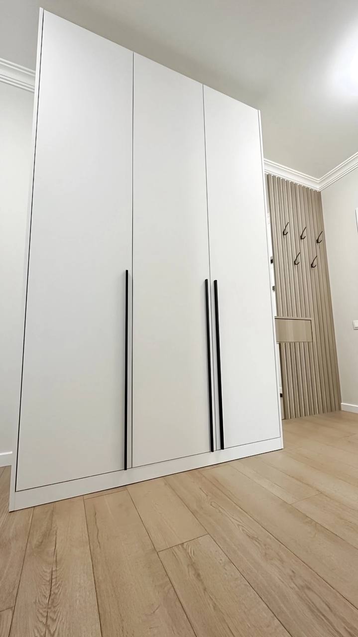 Лаконичная прихожая в современном стиле с высоким белым шкафом для верхней одежды и обуви. Контрастные черные ручки подчеркивают геометрию фасадов. Зона с декоративными вертикальными рейками и крючками дополняется подвесной консолью и зеркалом в полный рост, создавая удобное и светлое пространство для ежедневных сборов.