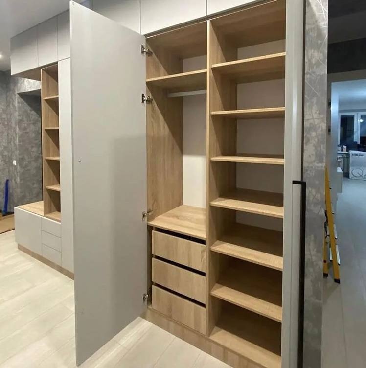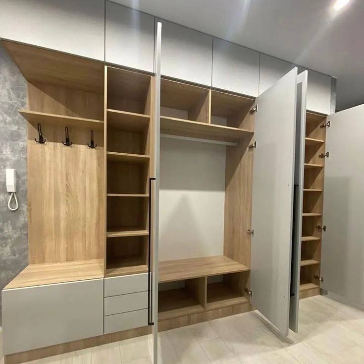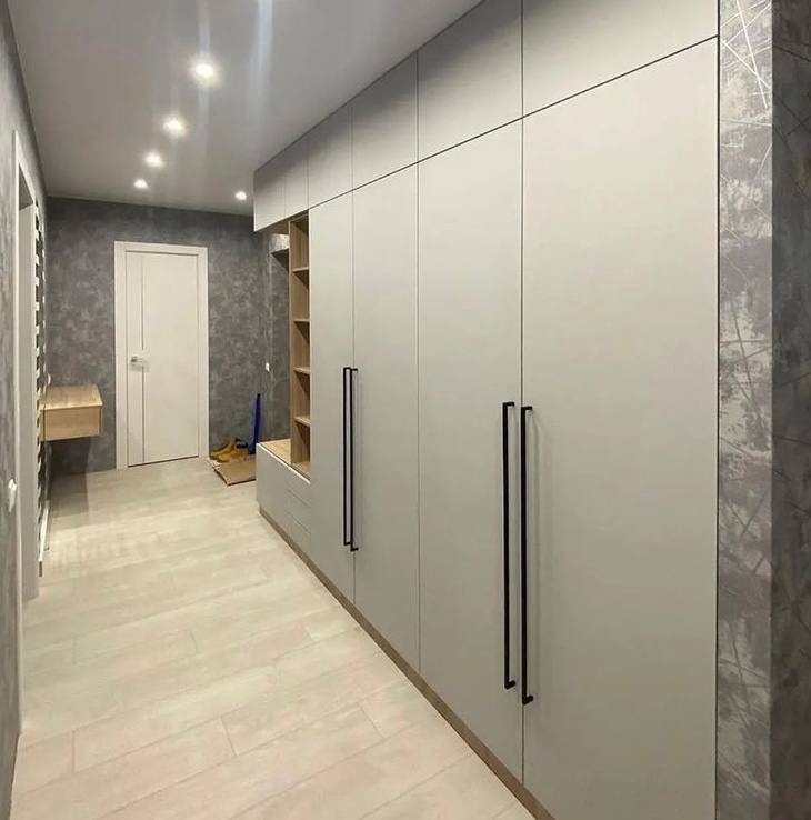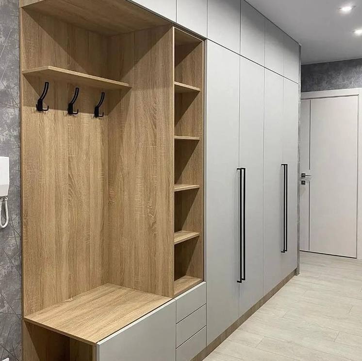 Функциональная прихожая в современном стиле с полноразмерным шкафом-купе и высокой системой шкафов до потолка. Встроенная открытая секция с крючками, полками и удобной скамьей создаёт комфортную зону для переобувания и хранения повседневных вещей. Лаконичные фасады светлого оттенка визуально расширяют пространство и поддерживают ощущение порядка и уюта.