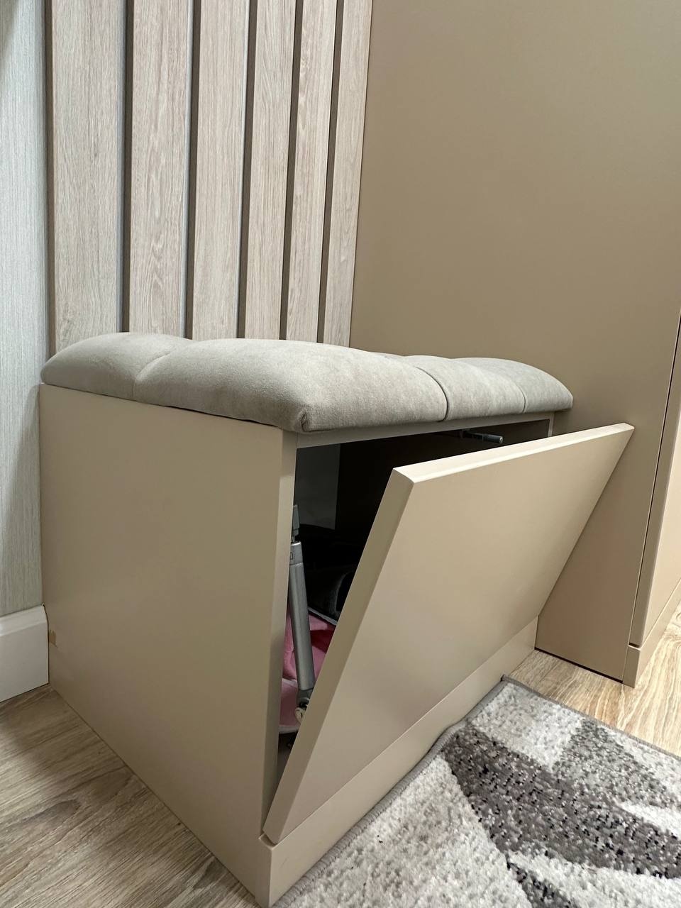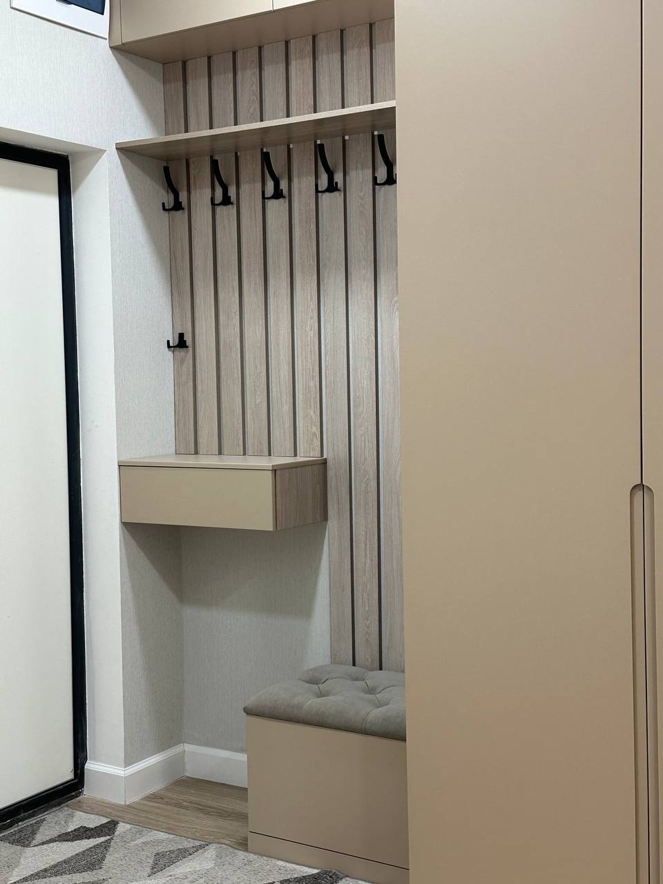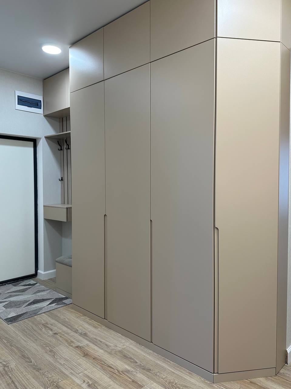 Лаконичная прихожая в современном стиле с высоким шкафом до потолка и гладкими фасадами без ручек. Внутри предусмотрены штанга для одежды и удобные полки для обуви и аксессуаров. Дополняет композицию мягкая банкетка с откидным коробом, обеспечивающая дополнительное место хранения и комфорт при переобувании.