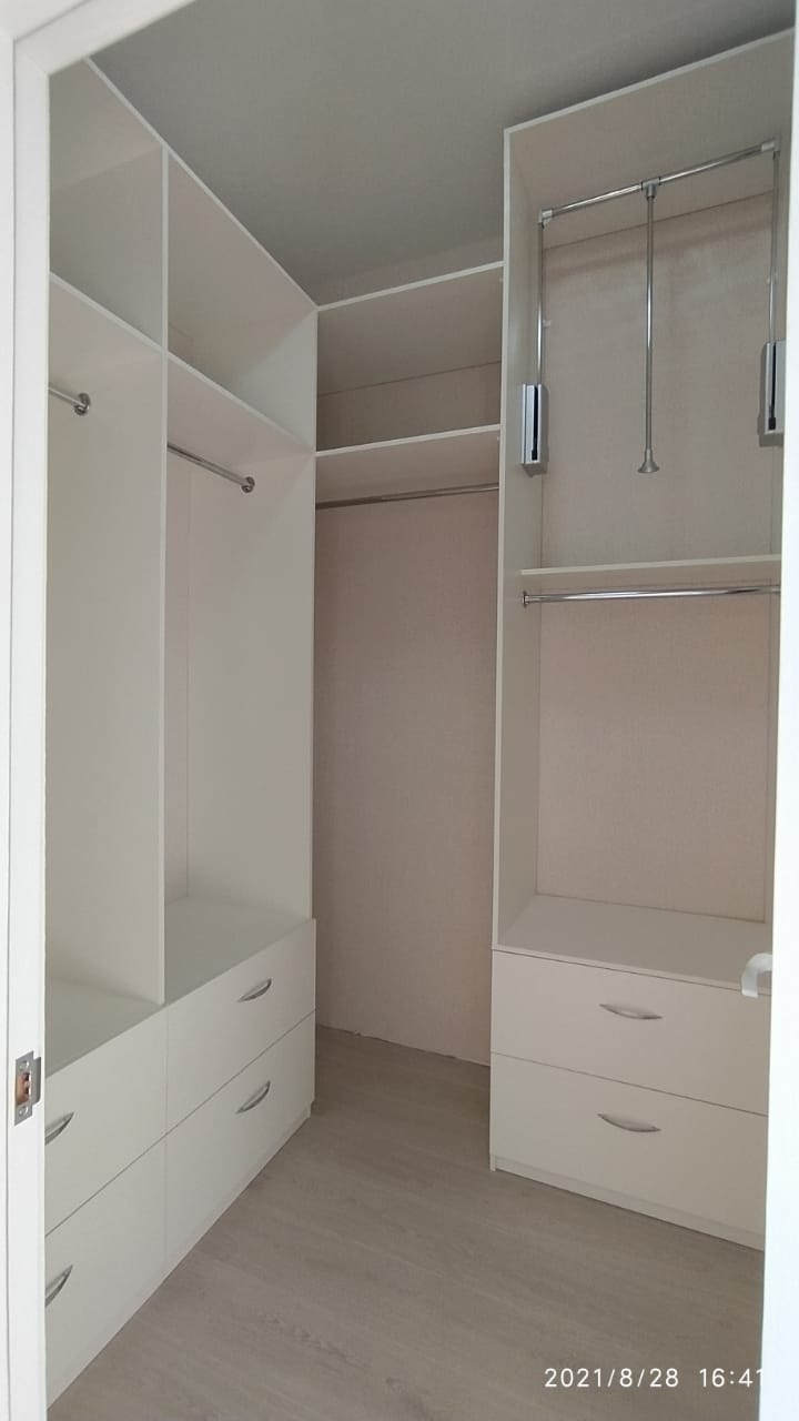 Просторная угловая гардеробная в светлых тонах с двумя уровнями хромированных штанг, открытыми полками и вместительными выдвижными ящиками. Рациональная планировка обеспечивает удобное размещение одежды, обуви и аксессуаров на компактной площади.