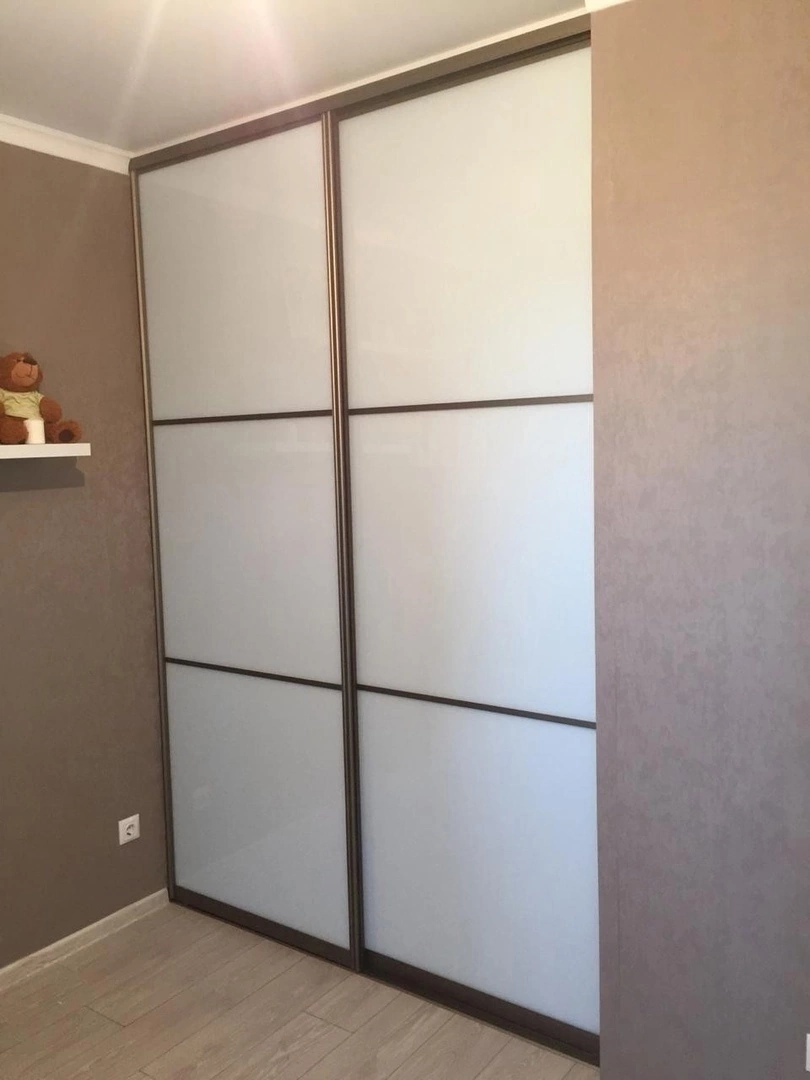 Компактный угловой шкаф-купе с белыми матовыми раздвижными фасадами идеально вписывается в современный интерьер. Внутреннее наполнение включает удобные открытые полки и отделение с штангой для одежды. Продуманная организация пространства обеспечивает аккуратное хранение вещей даже в небольшой комнате.