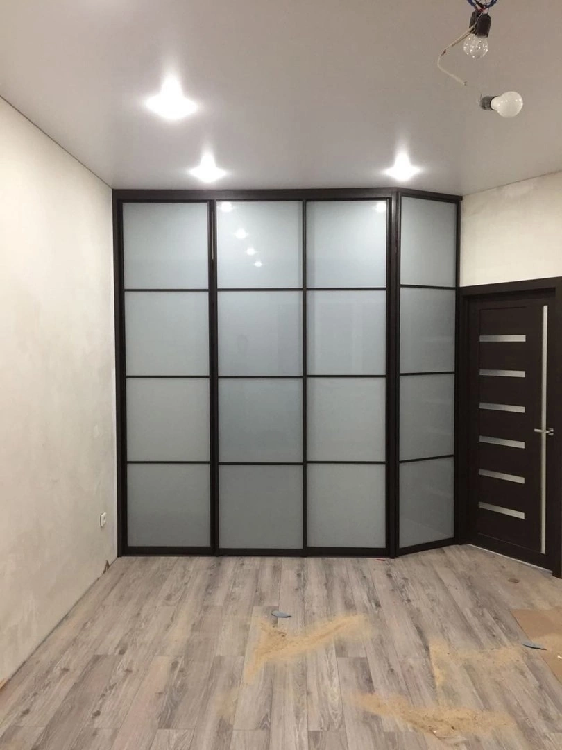 Угловой шкаф-купе во всю стену с раздвижными фасадами из матового стекла в тёмном профиле. Внутри предусмотрены открытые стеллажи, выдвижные ящики и секции под верхнюю одежду. Конструкция использует угол комнаты, создавая вместительную гардеробную зону и поддерживая современный минималистичный интерьер.