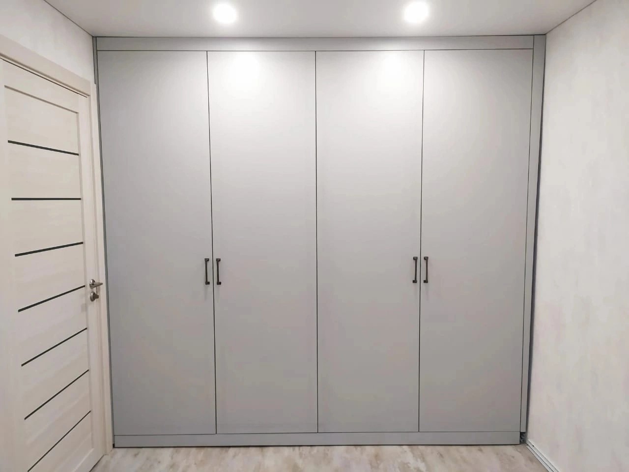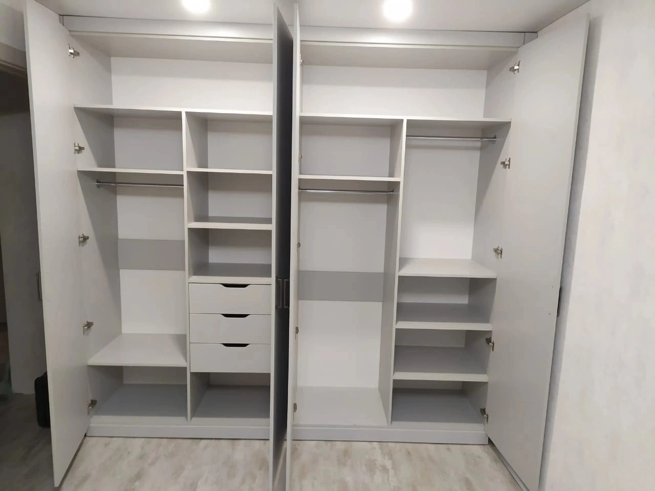Функциональный распашной шкаф во всю стену с лаконичными матовыми фасадами без лишнего декора. Внутреннее наполнение включает несколько зон для длинной и короткой одежды, открытую систему полок и выдвижные ящики для аксессуаров. Светлый оттенок визуально расширяет пространство и гармонично сочетается с современным интерьером спальни или гардеробной.