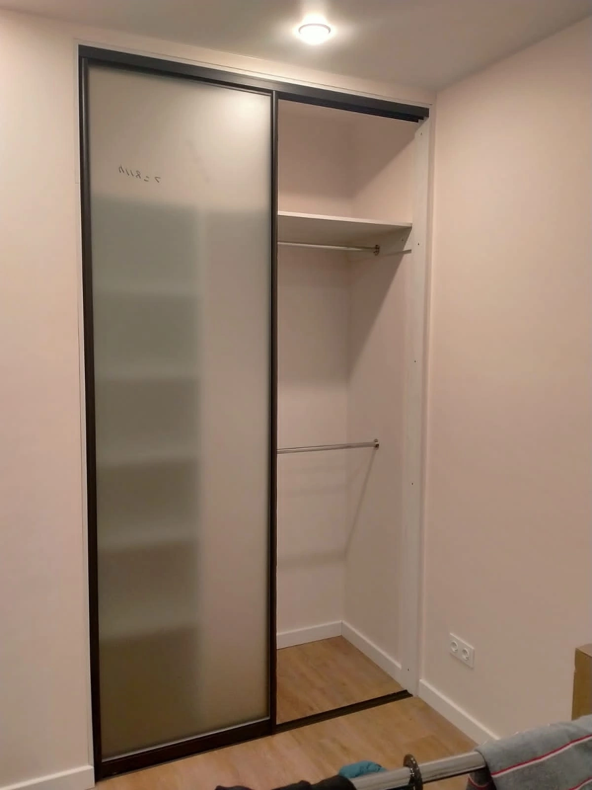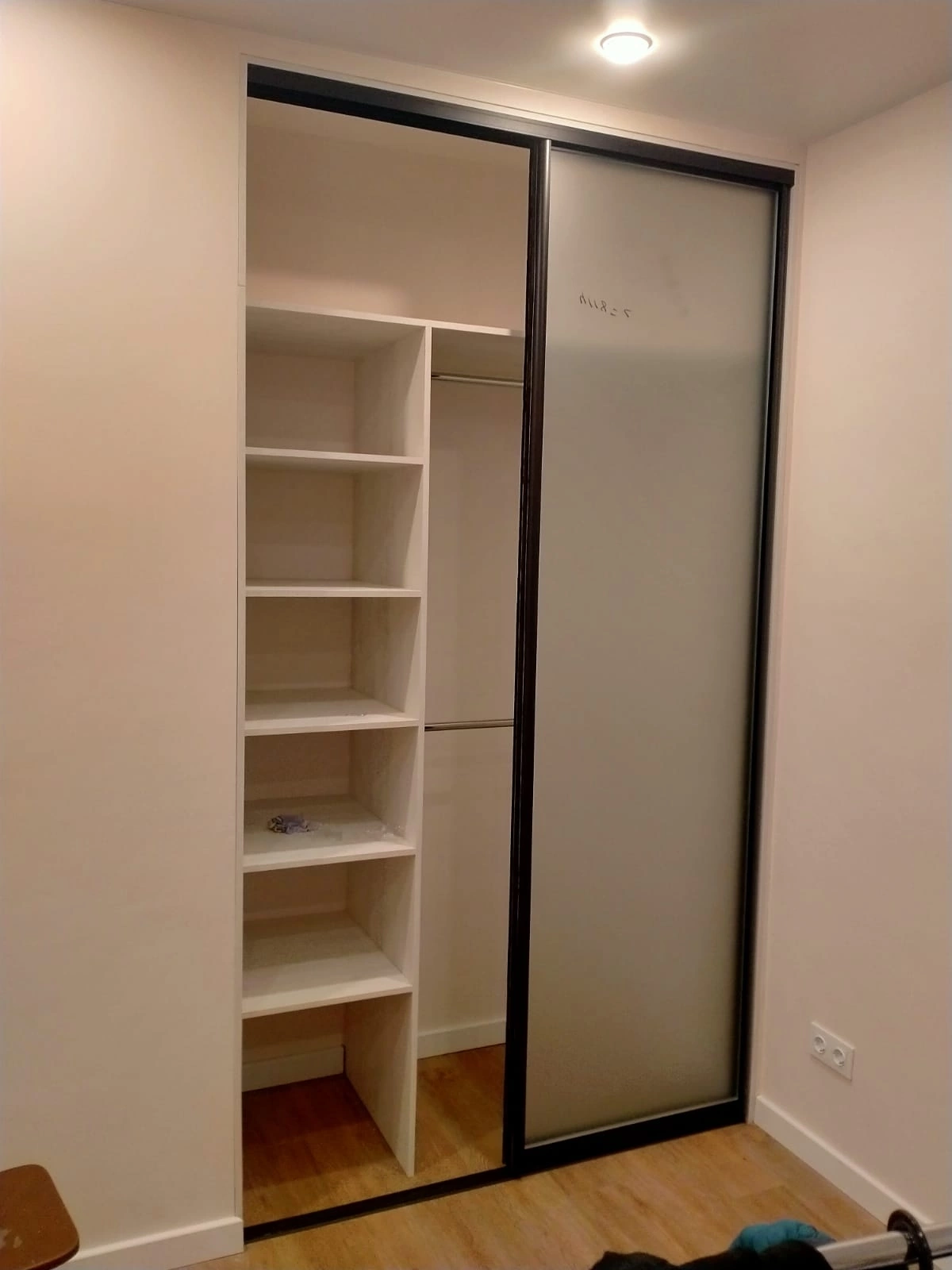 Компактный встроенный шкаф-купе с матовыми раздвижными дверями в темной алюминиевой раме. Внутреннее наполнение включает открытые стеллажи для сложенных вещей и отделения с штангами для одежды на вешалках. Рациональное зонирование и лаконичный дизайн идеально подойдут для небольшой спальни или прихожей.