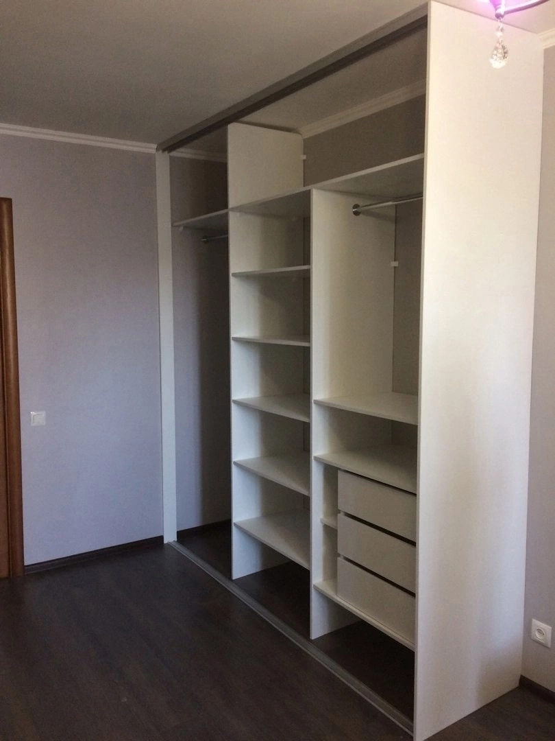 Просторный встроенный шкаф-купе в нейтральных светло-серых тонах с центральной зеркальной дверью визуально расширяет помещение и добавляет света. Внутреннее наполнение включает открытые полки, выдвижные ящики и несколько штанг для одежды, обеспечивая удобную организацию гардероба и рациональное использование пространства комнаты.