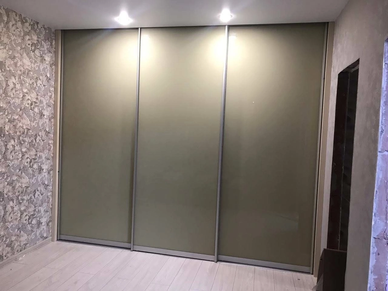 Функциональный встроенный шкаф-купе во всю стену с тремя раздвижными дверями в спокойном матовом оттенке. Центральная секция открытого типа оснащена удобными полками и выдвижными ящиками, обеспечивая быстрый доступ к часто используемым вещам. Идеальное решение для спальни или гардеробной в современном стиле.